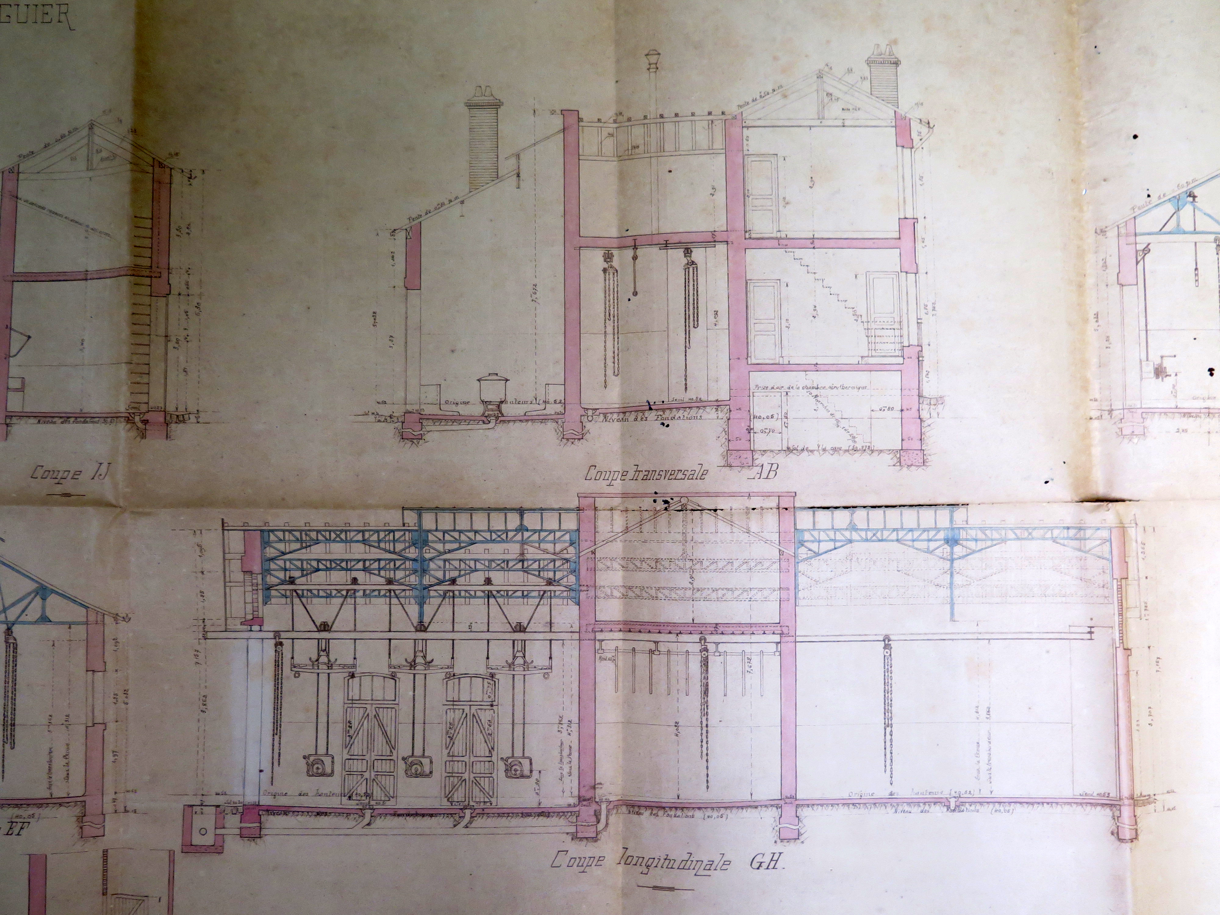 Tréguier, rue du Guindy : détail des coupes (feuille n° 4) de l'abattoir de la ville de Tréguier, 2 mai 1908 (Archives municipales de Tréguier, 1M9)Immatriculation