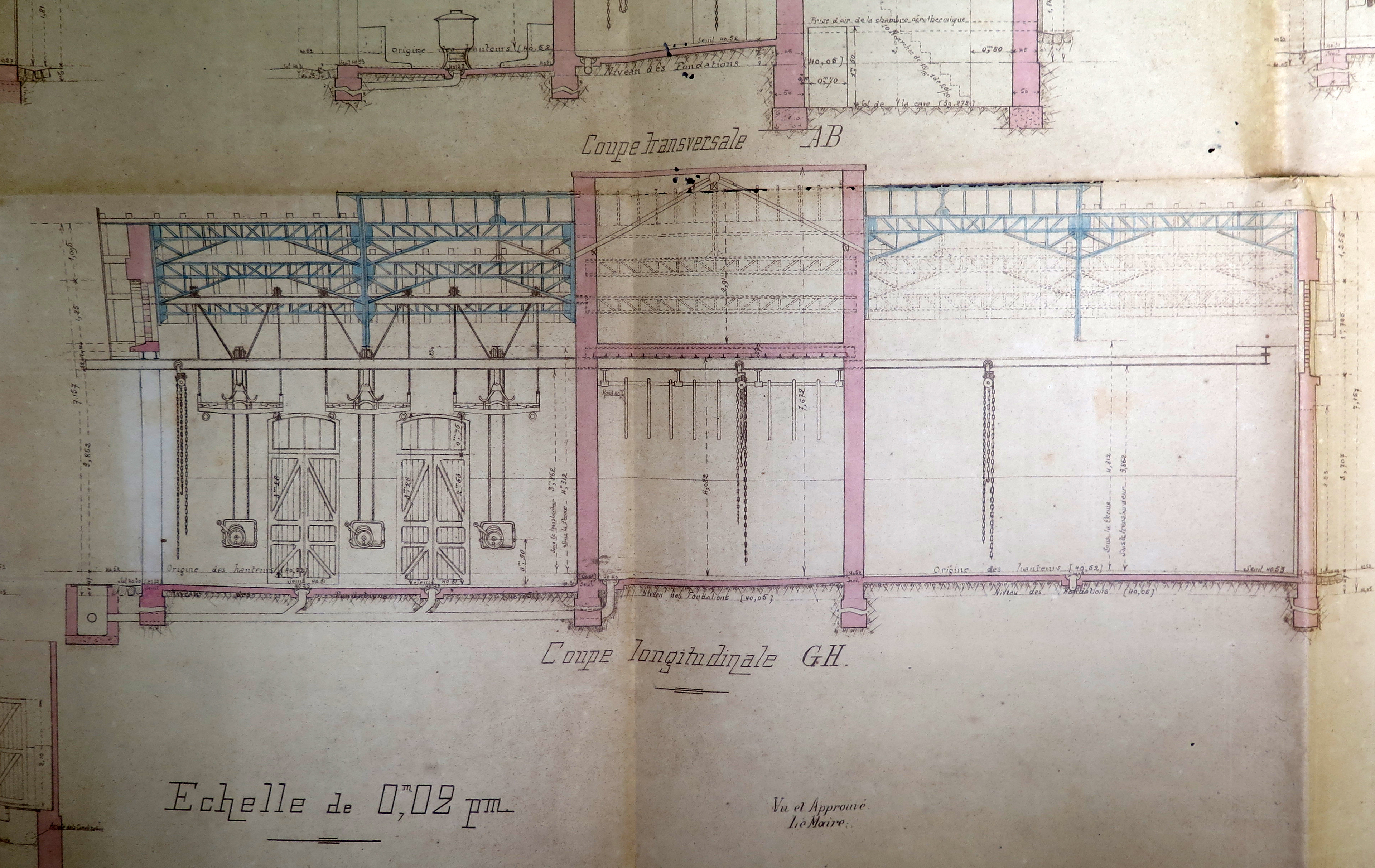 Tréguier, rue du Guindy : détail des coupes (feuille n° 4) de l'abattoir de la ville de Tréguier, 2 mai 1908 (Archives municipales de Tréguier, 1M9)Immatriculation