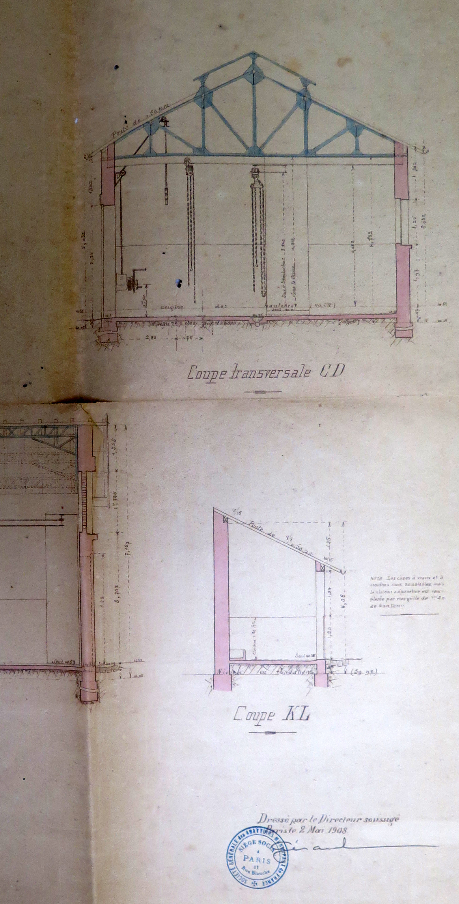Tréguier, rue du Guindy : détail des coupes (feuille n° 4) de l'abattoir de la ville de Tréguier, 2 mai 1908 (Archives municipales de Tréguier, 1M9)Immatriculation