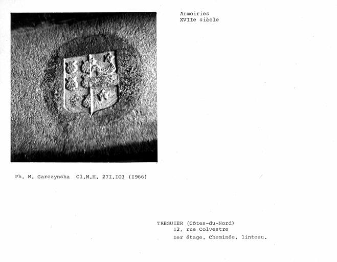 Tréguier, 12 rue Colvestre : maison à pan de bois, cheminée, détail des armoiries, 1966 (Ministère de la Culture (France), Médiathèque de l'architecture et du patrimoine (Centre de recherche des monuments historiques - CRMH, diffusion RMN), sap91_mh00271103_p)Immatriculation