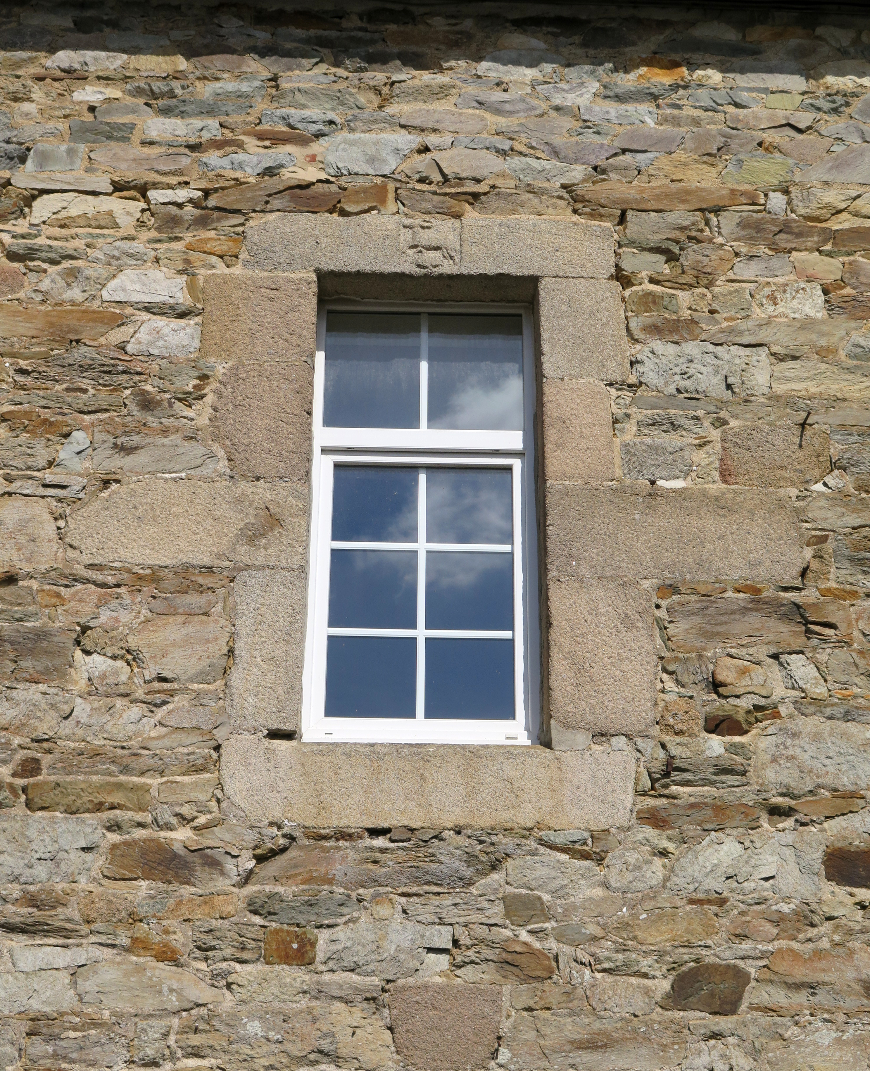 Tréguier, 9 rue des Perdreries (Perderies) : maison dite "Scolasticat", aile nord en retour d’équerre vers l’est, élévation sud sur cour, détail d'une fenêtre armoriée du premier étage, état en 2017Immatriculation