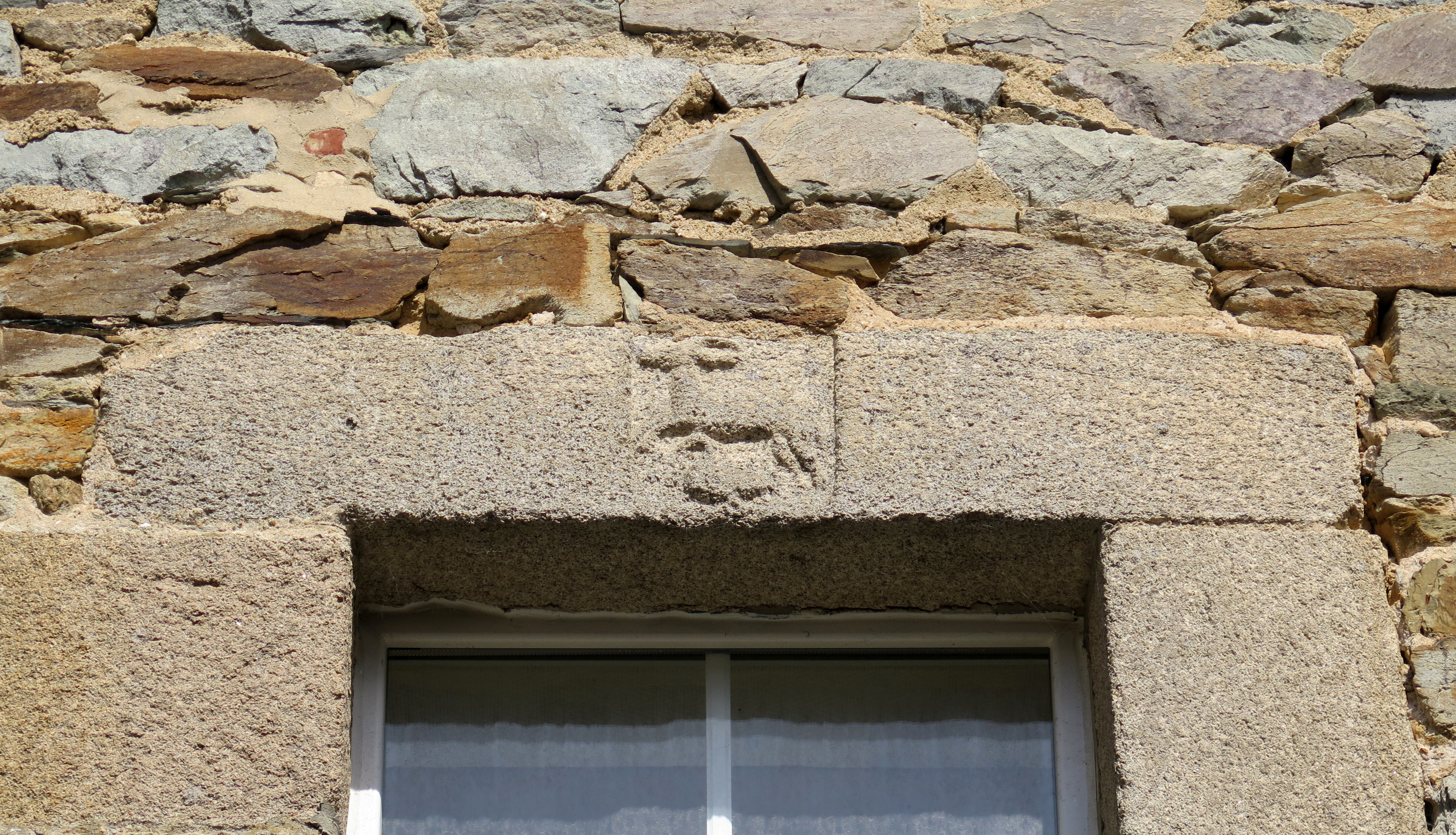 Tréguier, 9 rue des Perdreries (Perderies) : maison dite "Scolasticat", aile nord en retour d’équerre vers l’est, élévation sud sur cour, détail d'une fenêtre armoriée du premier étage, état en 2017Immatriculation