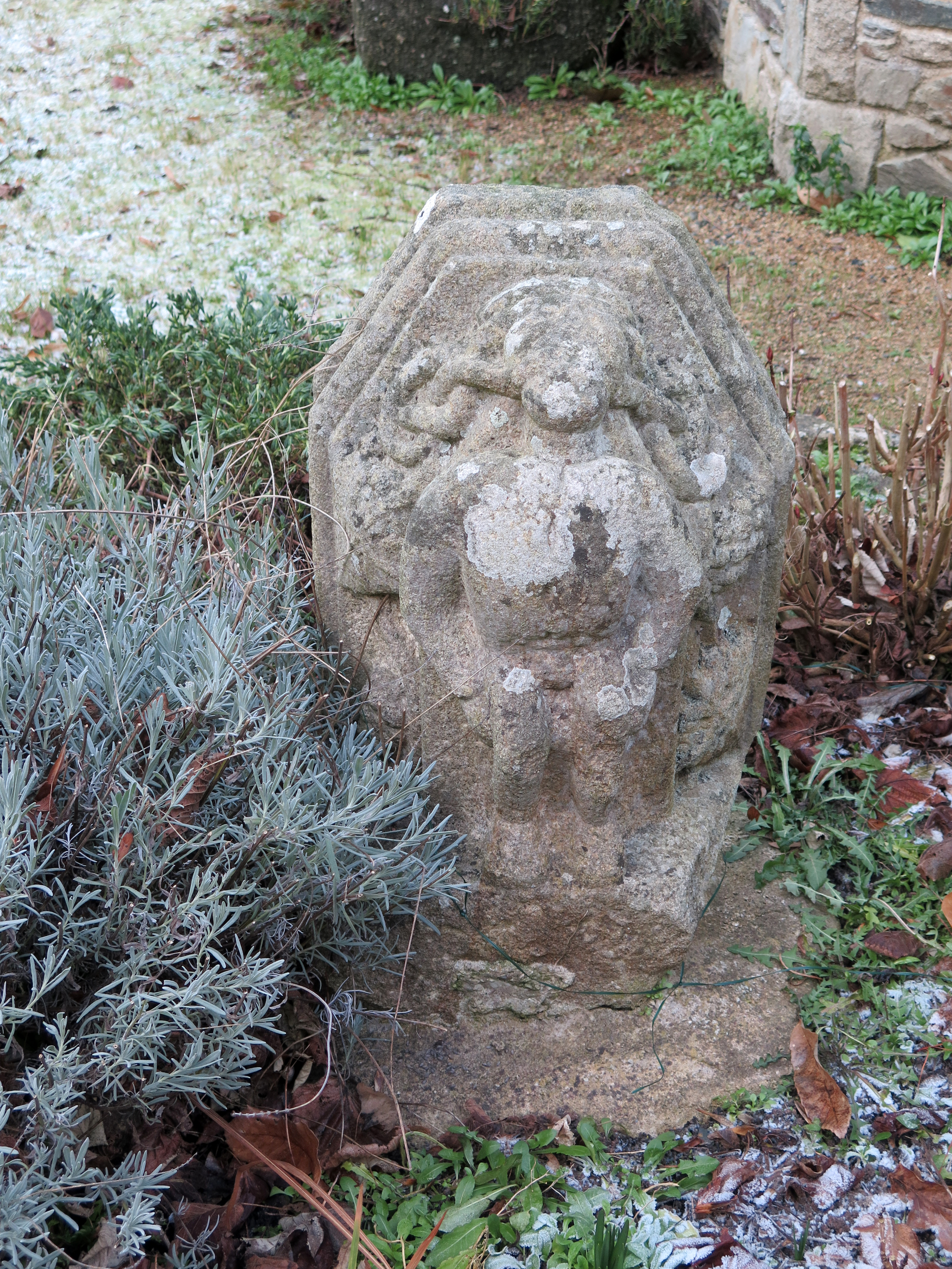 Tréguier, 12-16 rue des Perdreries (Perderies) : élément ancien sculpté dans le jardin (corbelet de cheminée ou console ?)Immatriculation