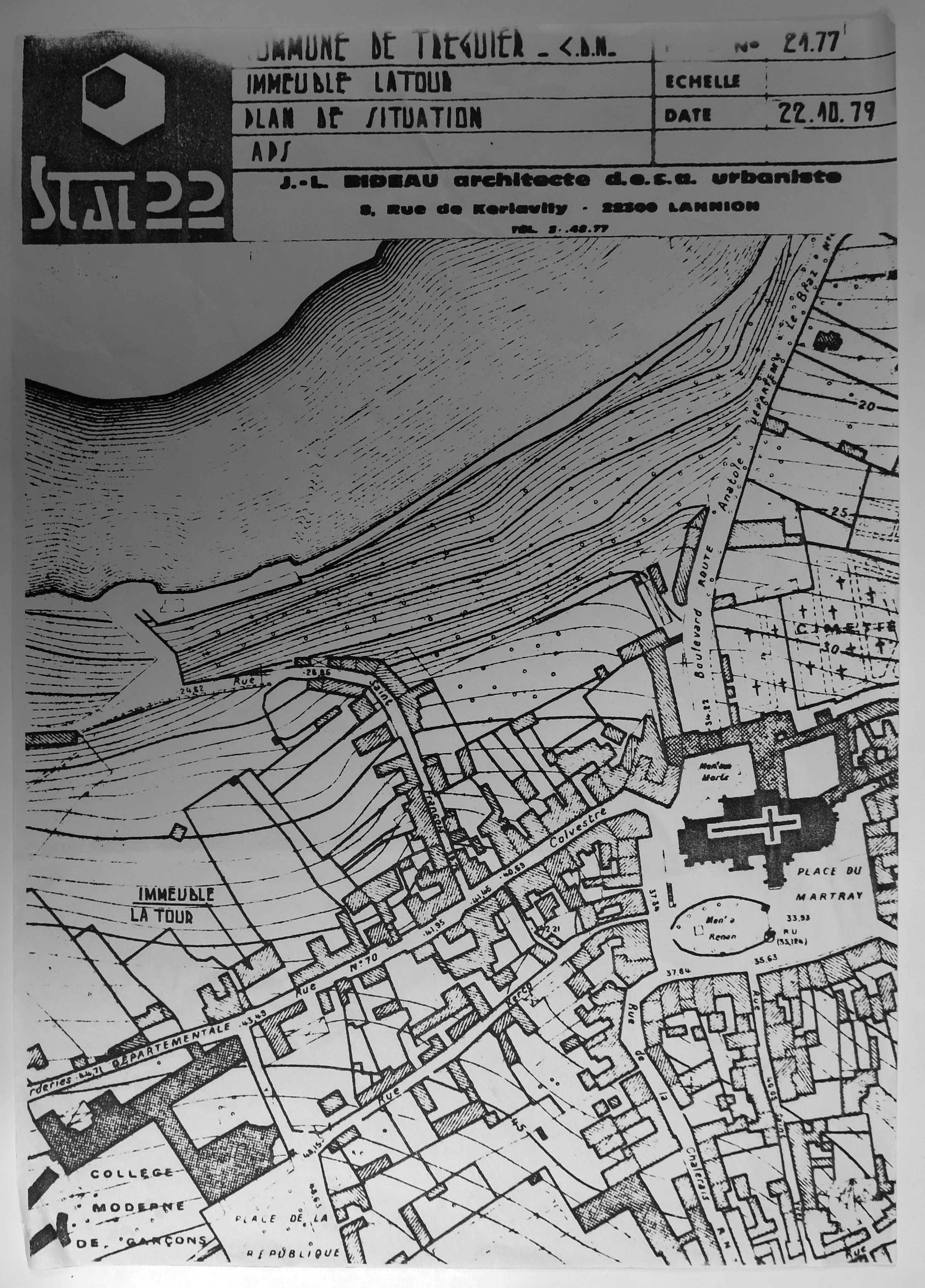 Projet de transformation en immeuble à logements de l'Hôtel de La Tour par l'architecte Jean-Louis Bideau, plan de situation, 22 octobre 1979 (Archives municipales de Tréguier, 6M6)Immatriculation