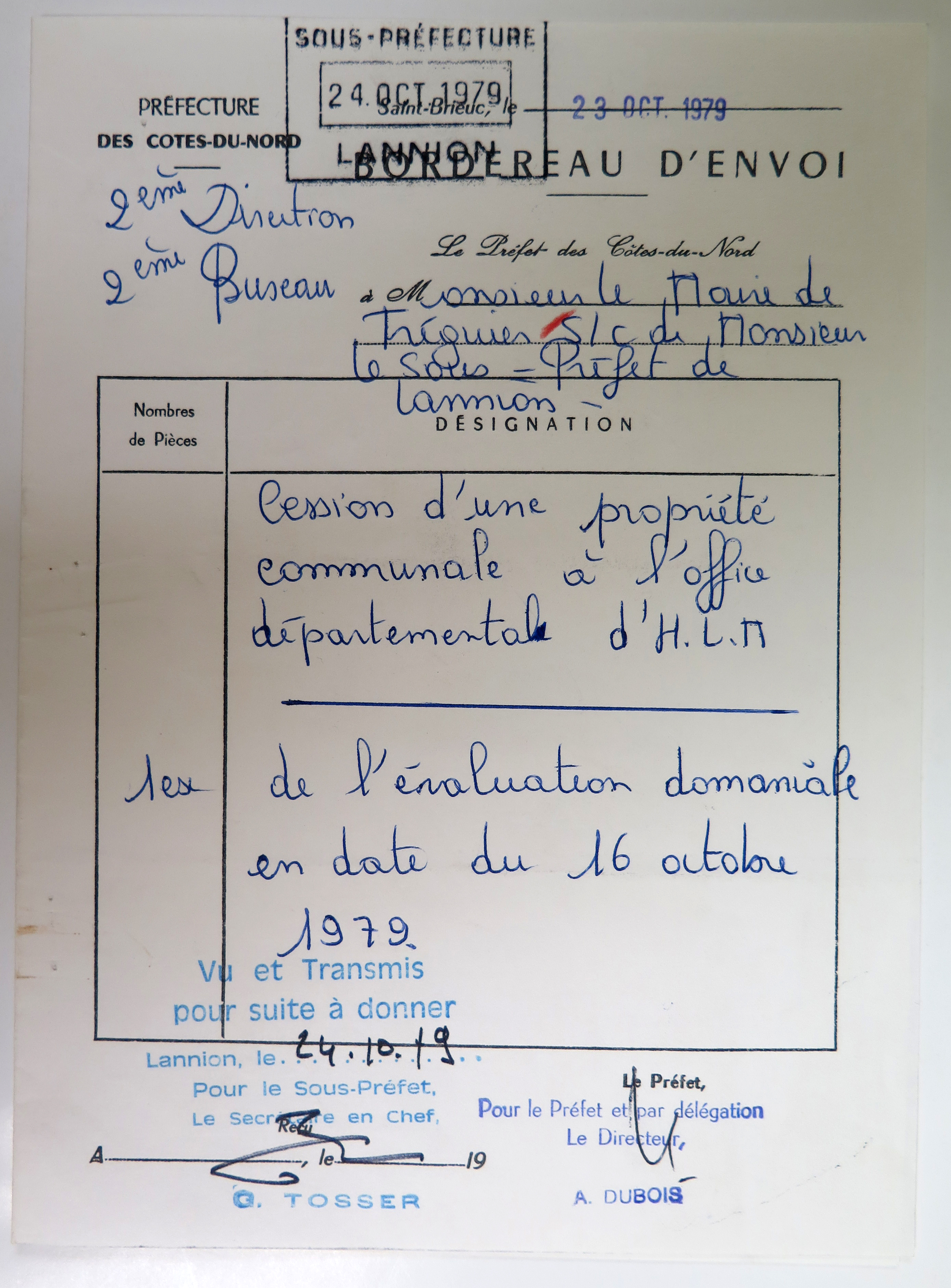Cession de l'immeuble à logements de l'Hôtel à l'Office départemental des Habitations à loyer modéré (HLM) le 16 octobre 1979 (Archives municipales de Tréguier, 6M6)Immatriculation