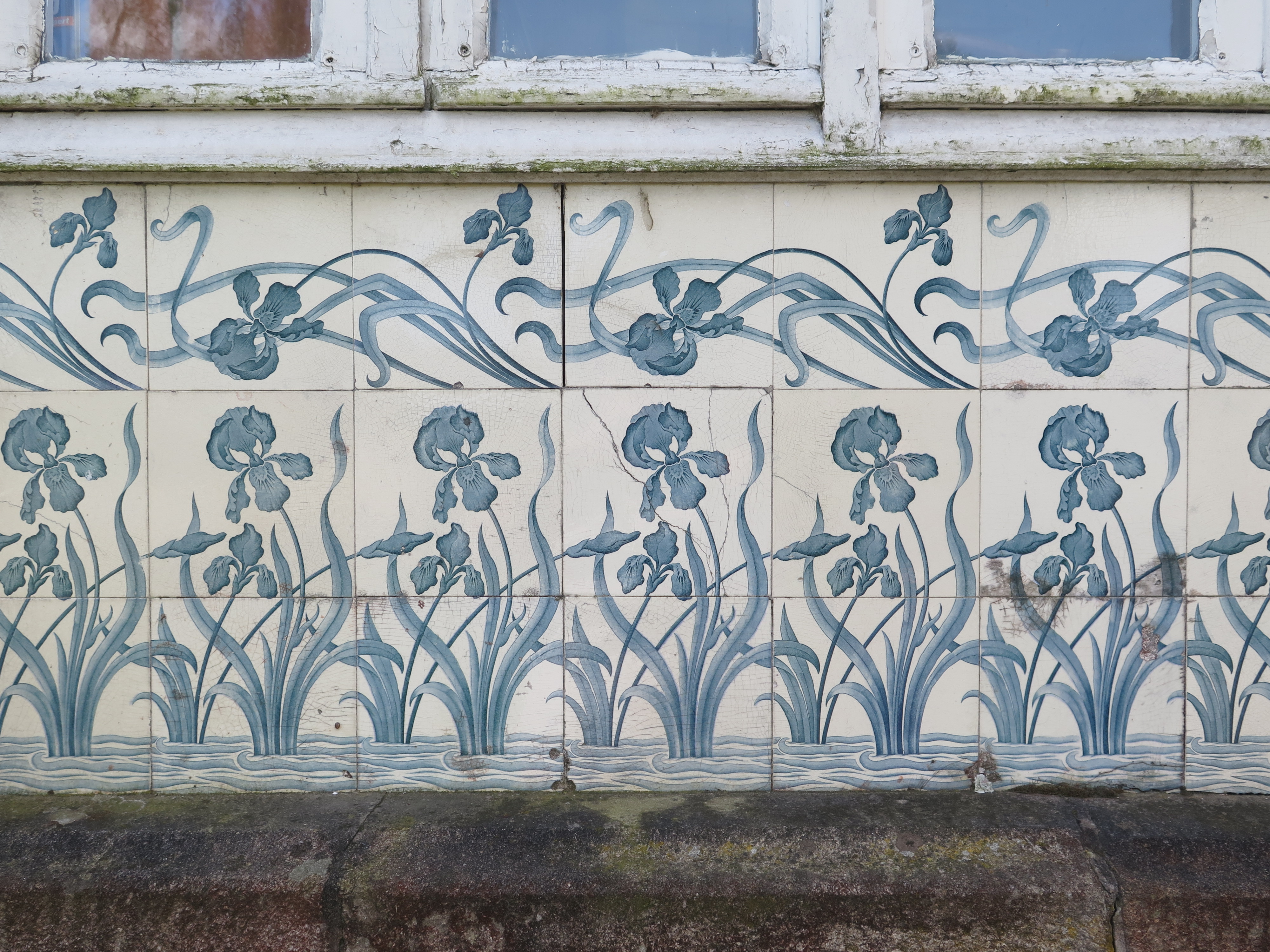 Tréguier, 8 rue Lamennais : maison, petite dépendance est, détail des carreaux type faïence de Delft au lys bleuImmatriculation