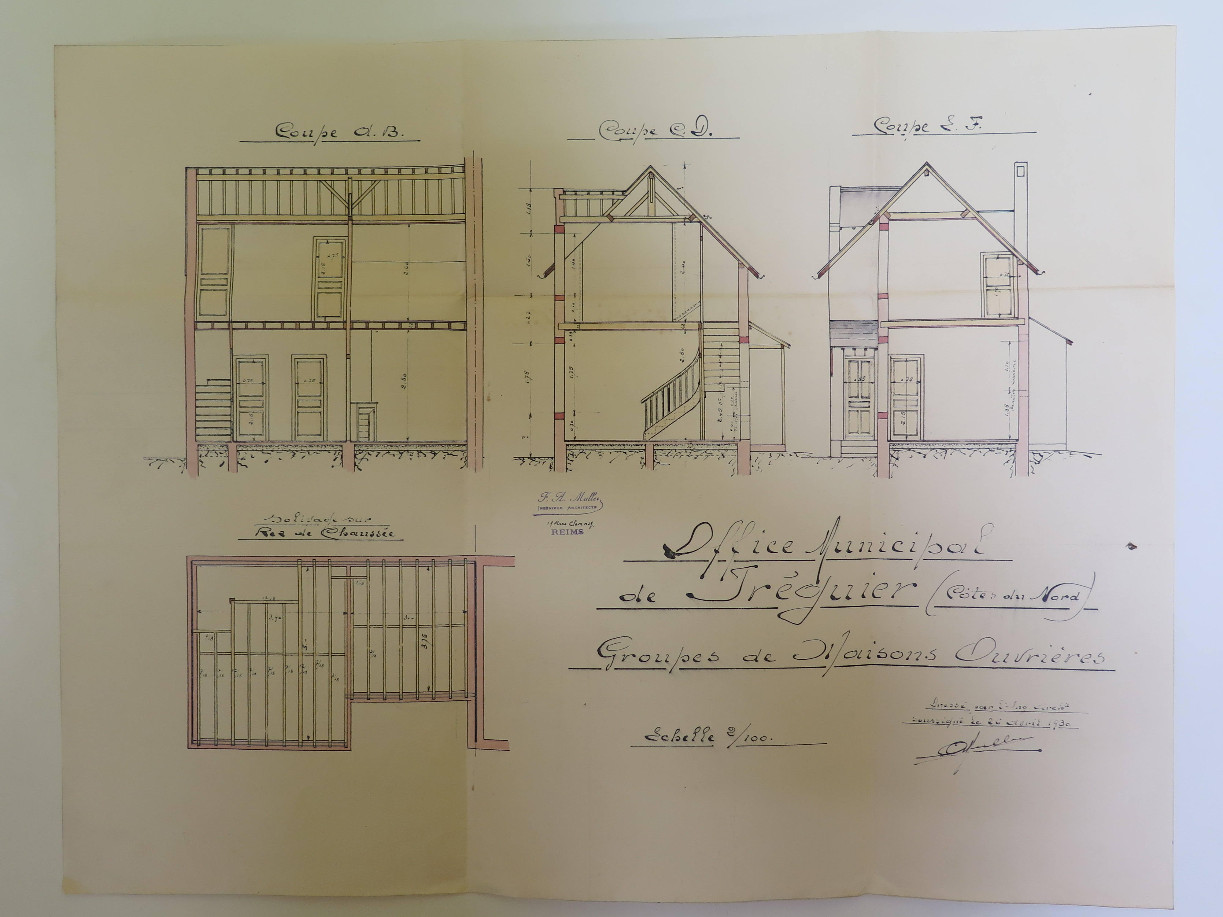 Tréguier : coupe d'un groupe de maisons ouvrières, projet de l'ingénieur architecte Muller de Reims, 26 avril 1930 (Archives municipales de Tréguier, 1W5)Immatriculation