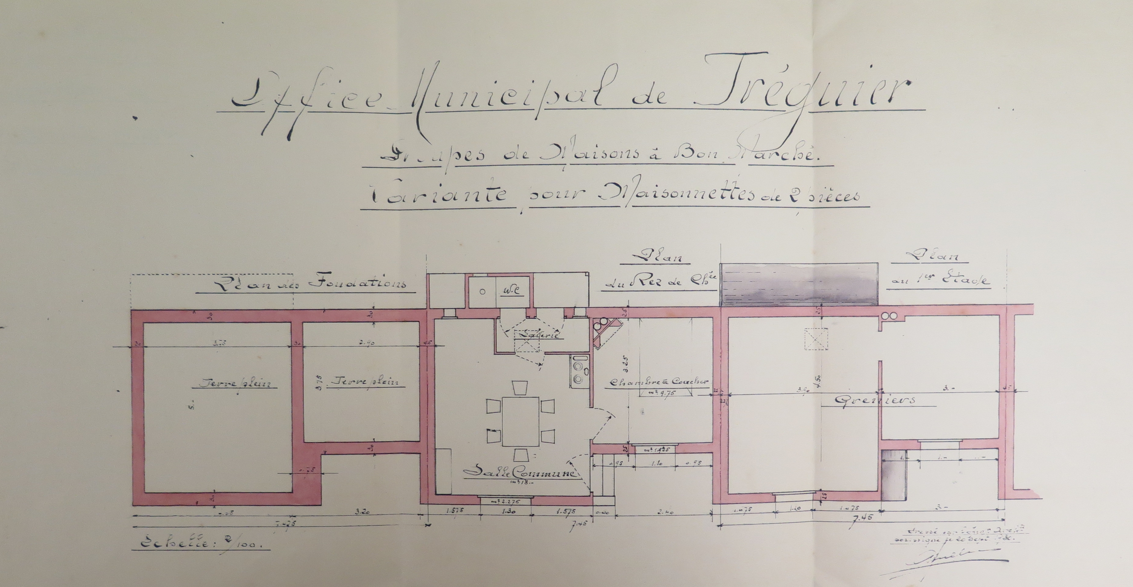 Tréguier : plan d'un groupe de maisons à bon marché (variante pour maisonnettes de 2 pièces), projet de l'ingénieur architecte Muller de Reims, 20 septembre 1930 (Archives municipales de Tréguier, 1W5)Immatriculation