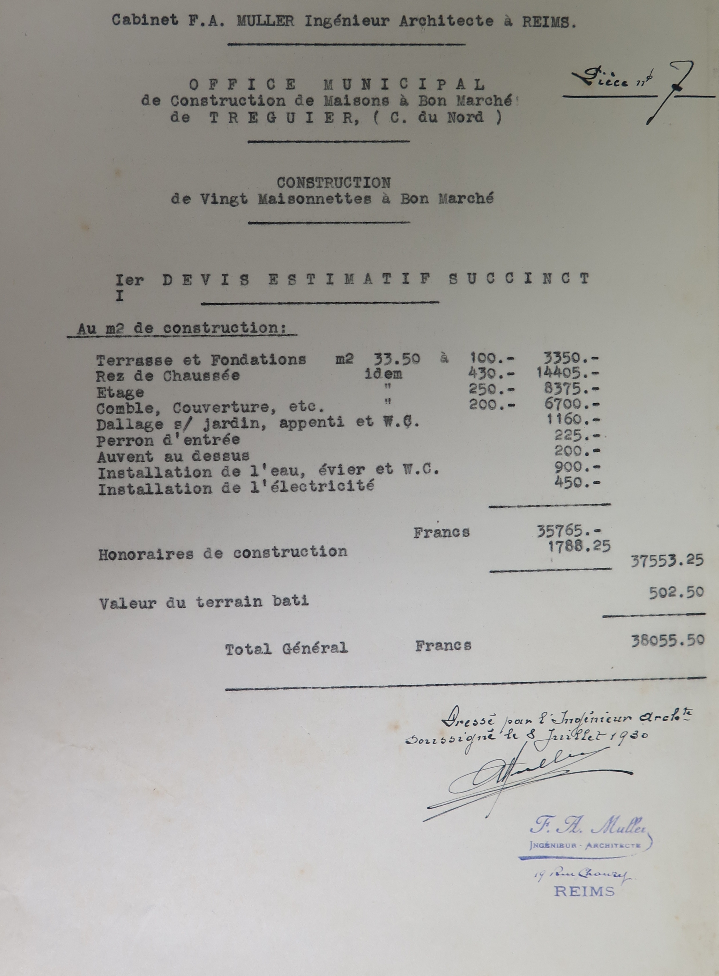 Tréguier : devis estimatif succinct pour la construction de 20 maisonnettes à bon marché (pièce n° 7), projet de l'ingénieur architecte Muller de Reims, 8 juillet 1930 (Archives municipales de Tréguier, 1W5)Immatriculation