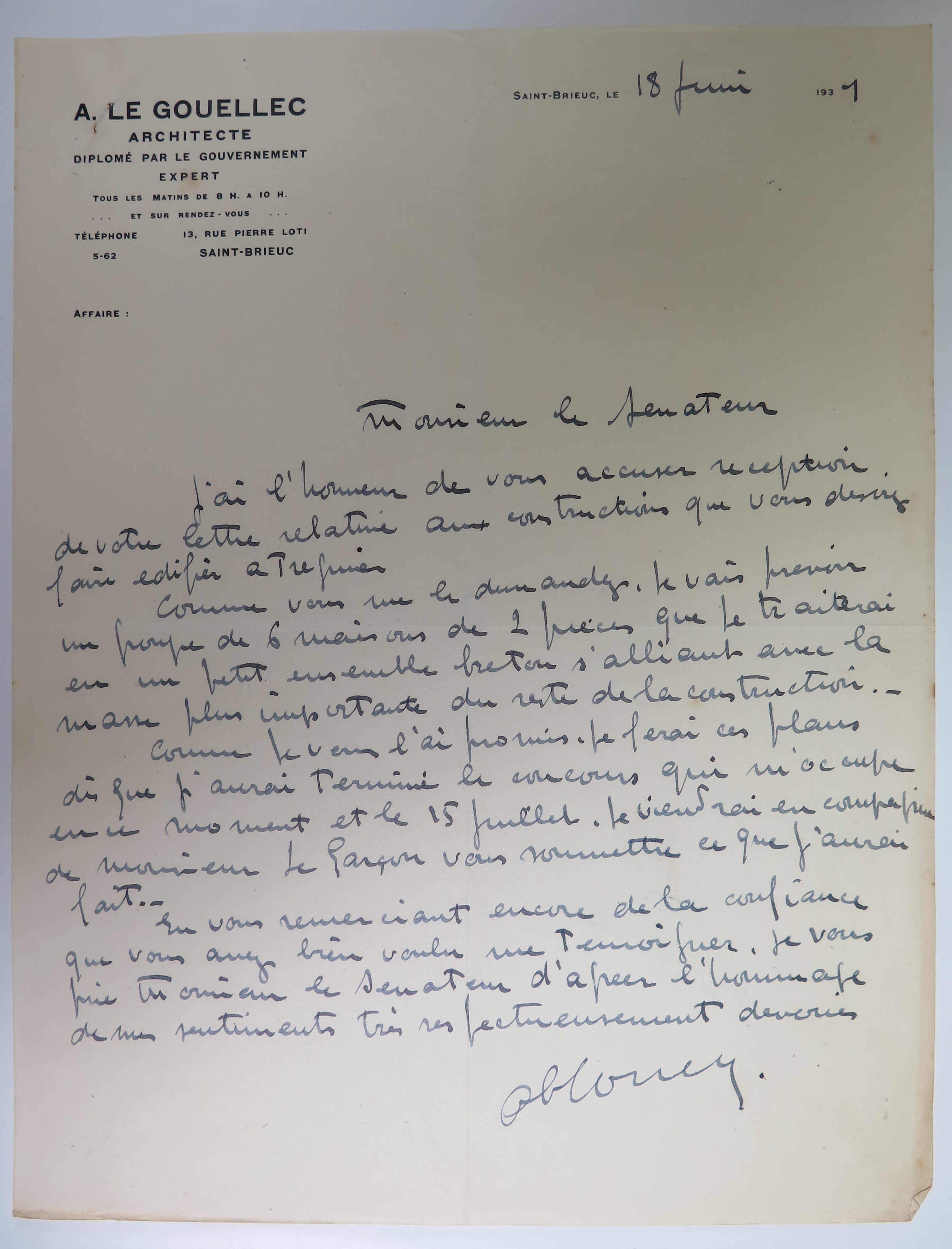 Tréguier : réponse du cabinet de l'architecte Adolphe Le Gouëllec à la demande de Gustave de Kerguezec pour la construction de logements, 18 juin 1931 (Archives municipales de Tréguier, 1W5)Immatriculation