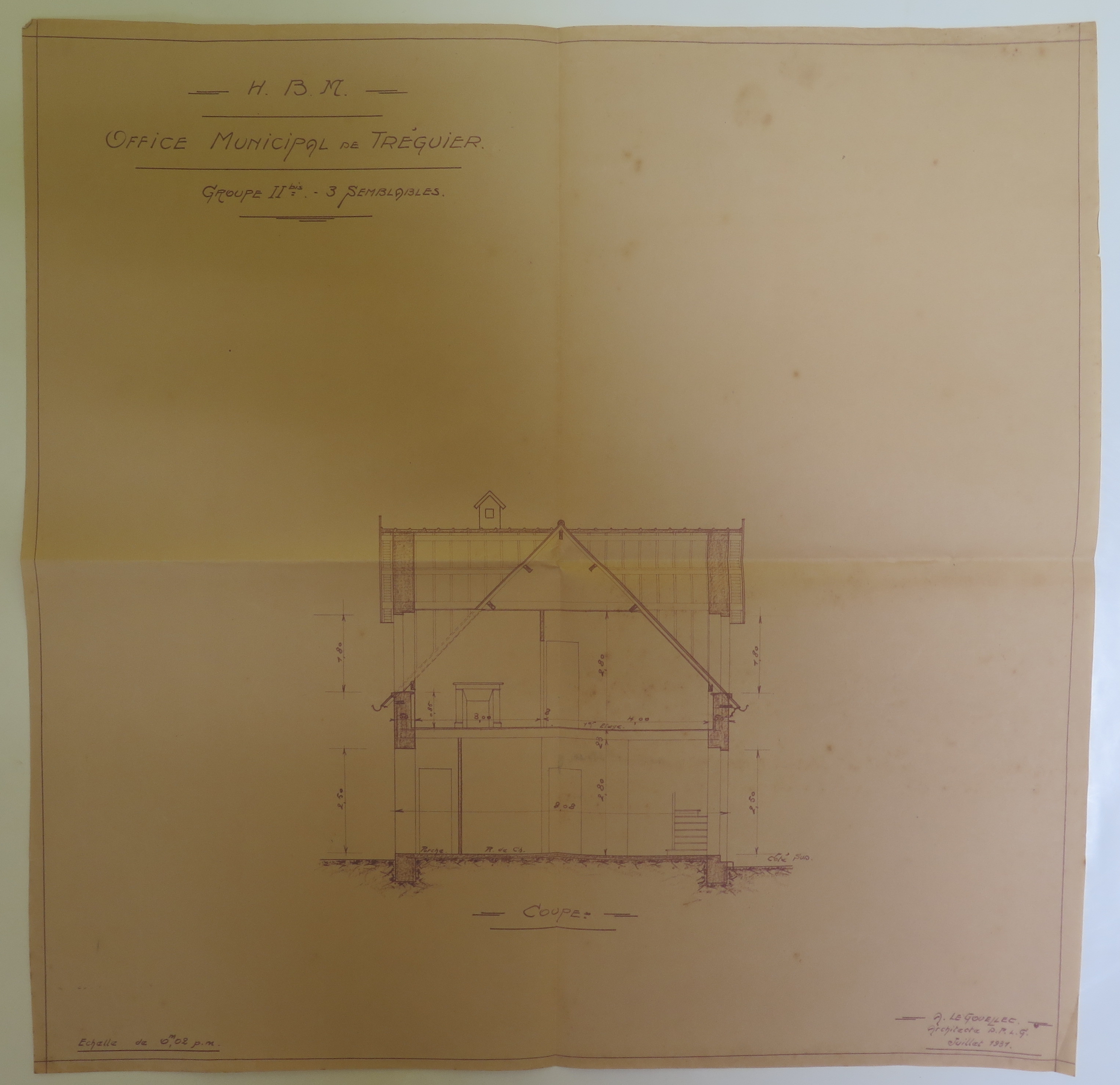 Tréguier : habitations à bon marché, 3 groupes semblables, type II bis, coupe, projet de l'architecte Le Gouëllec de Saint-Brieuc, 1er juillet 1931 (Archives municipales de Tréguier, 1W5)Immatriculation