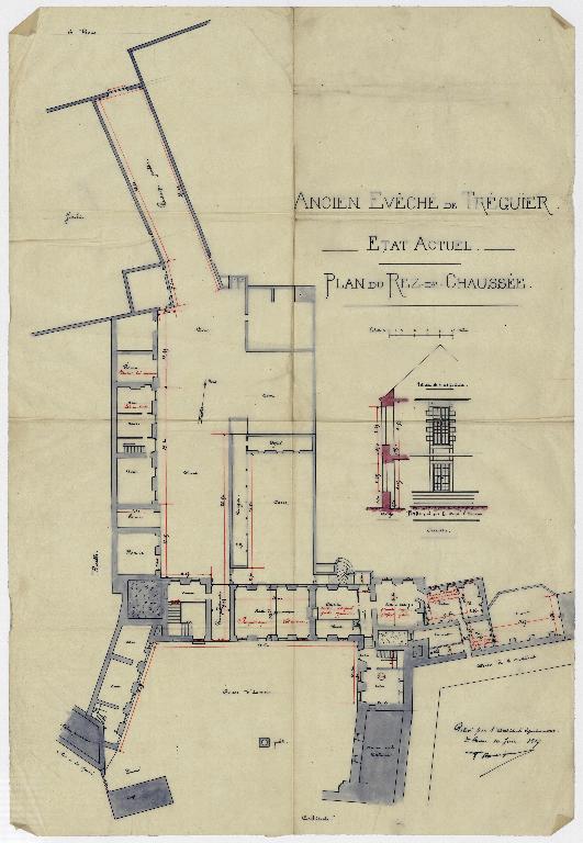 Plan du rez-de-chaussée et coupe sur la cour d’honneur de l'ancien évêché de Tréguier, état avant travaux, dressé par l’architecte départemental, 10 juin 1917.