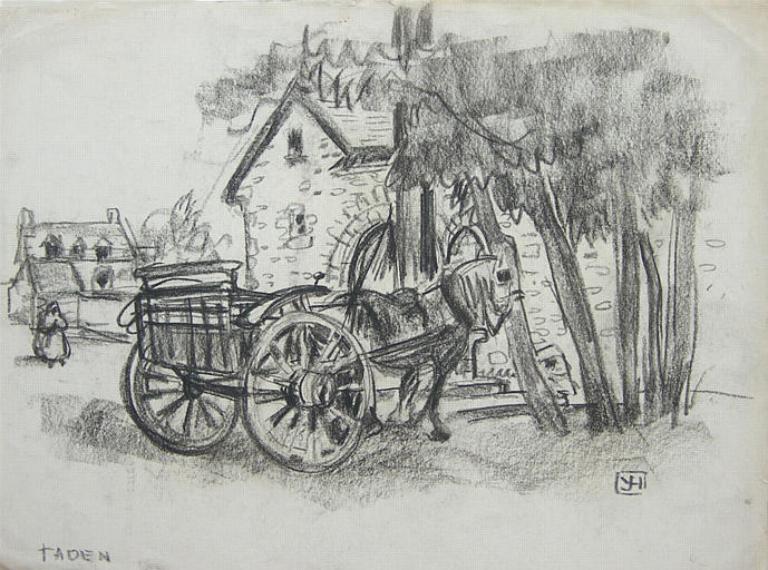Le village de Taden, la maison de Pierre Corseul en deuxième plan, dessin par Yvonne Jean-Haffen, vers 1944Immatriculation