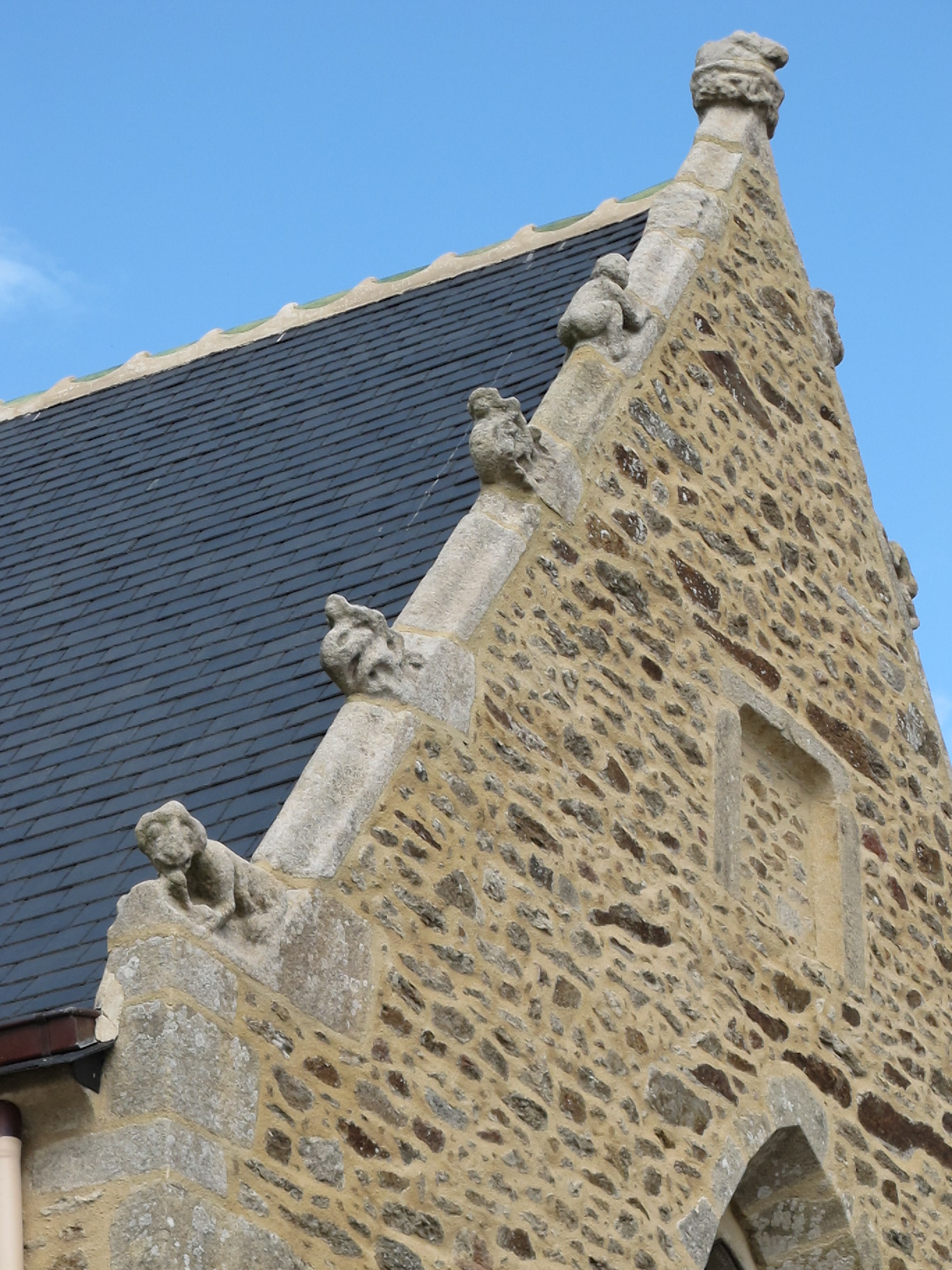 Chapelle sud, vue d'ensemble d'un rampant de pignon avec décor sculpté, animal, feuilles retournées, personnage dénudéImmatriculation