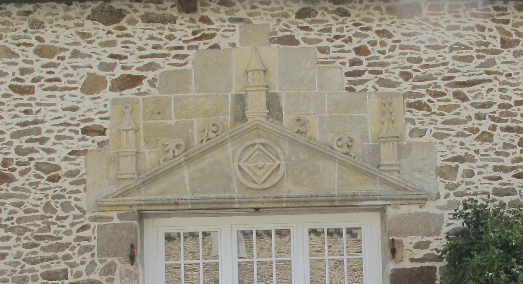 Communs, aile sud, détail du portail à fronton et candélabreImmatriculation