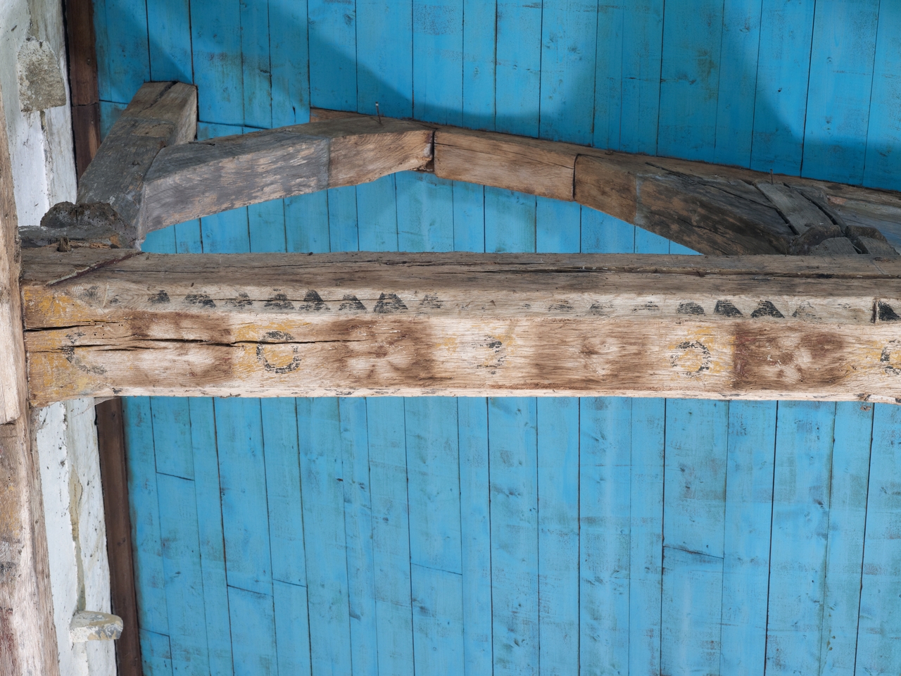 Charpente du bas côté sud : entrait à décor de fleurs et de cerclesImmatriculation