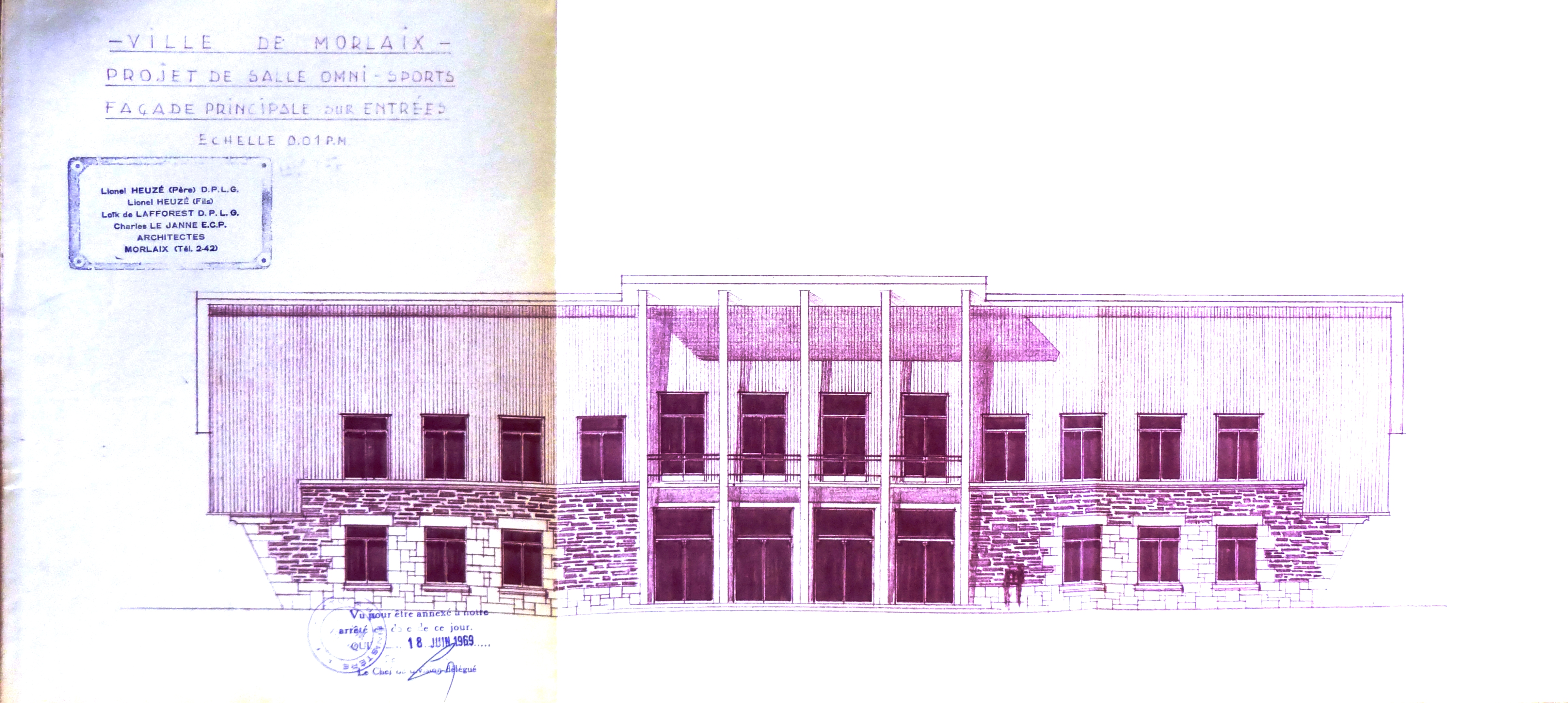 AD Finistère : 137 W 160. Projet de salle omnisports, façade principale sur entrées. L. Heuzé, 1969.