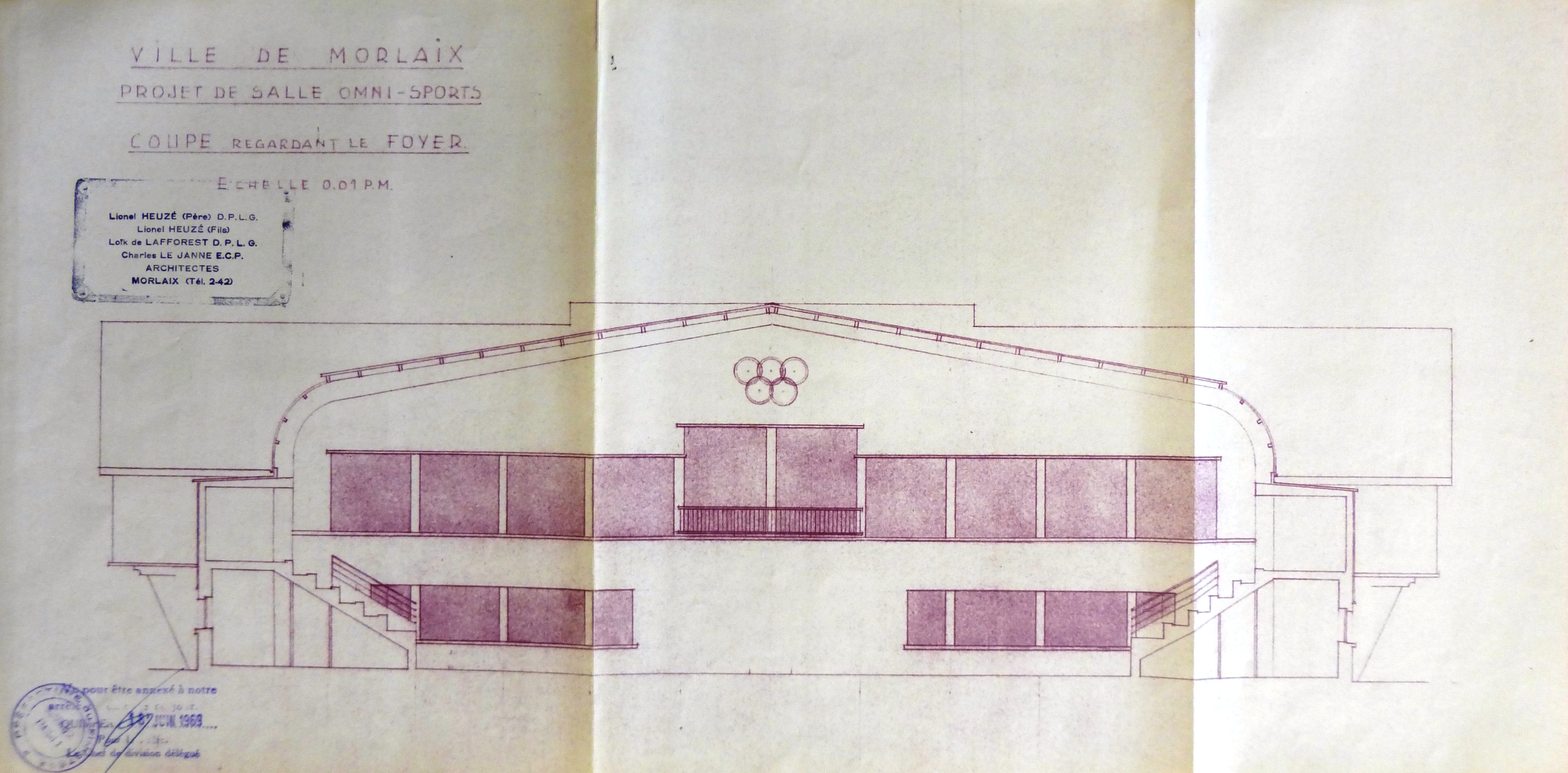 AD Finistère : 137 W 160. Salle omnisports, coupe regardant le foyer. L. Heuzé, 1969.
