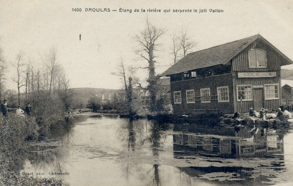 Carte postale : Daoulas, étang de la rivière. Ed. Le Doaré. Représente la scierie mécanique.Immatriculation