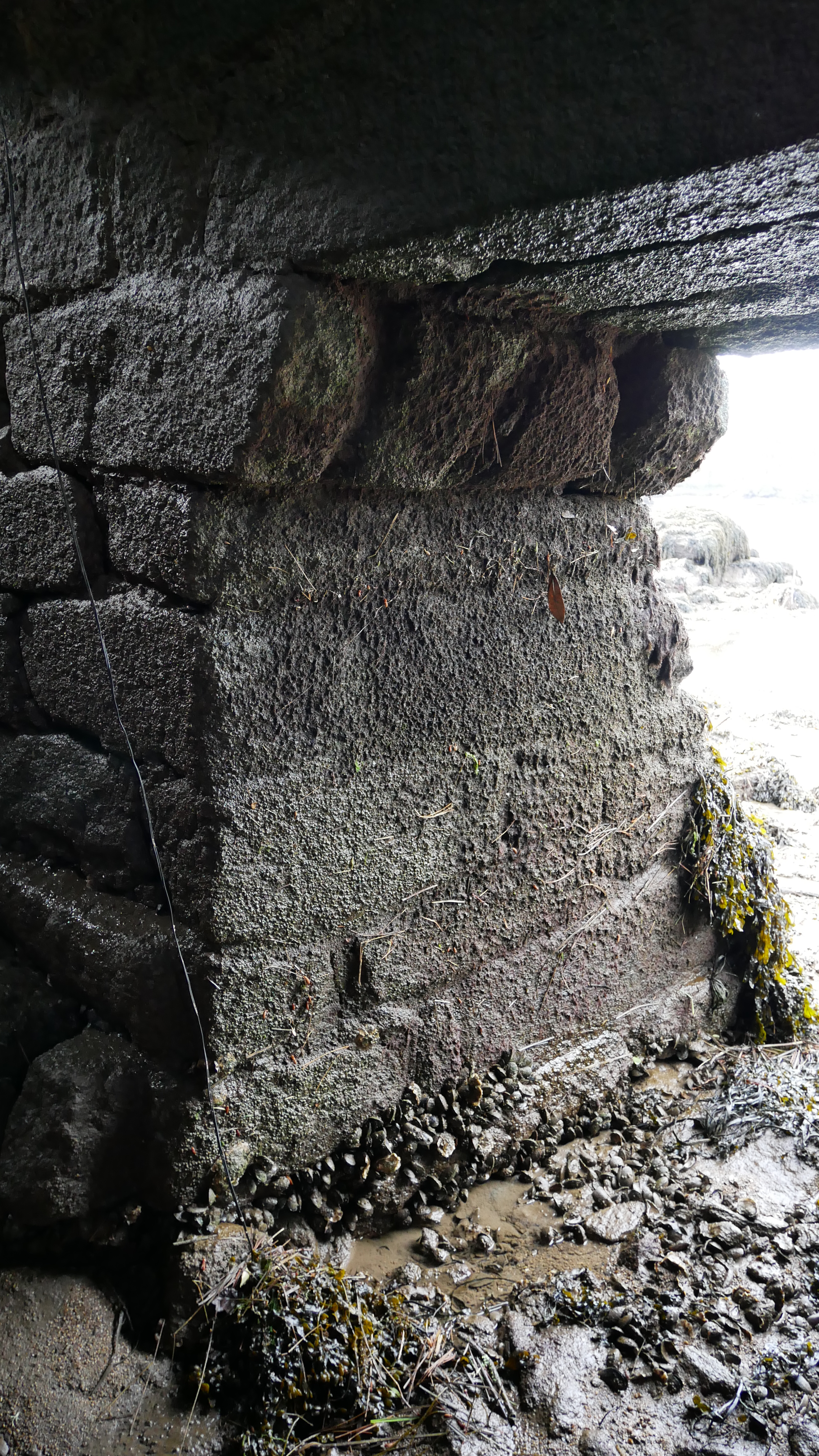 Galerie du sous-sol donnant sur l'aval du moulin avec sa voûte plate en pierreImmatriculation