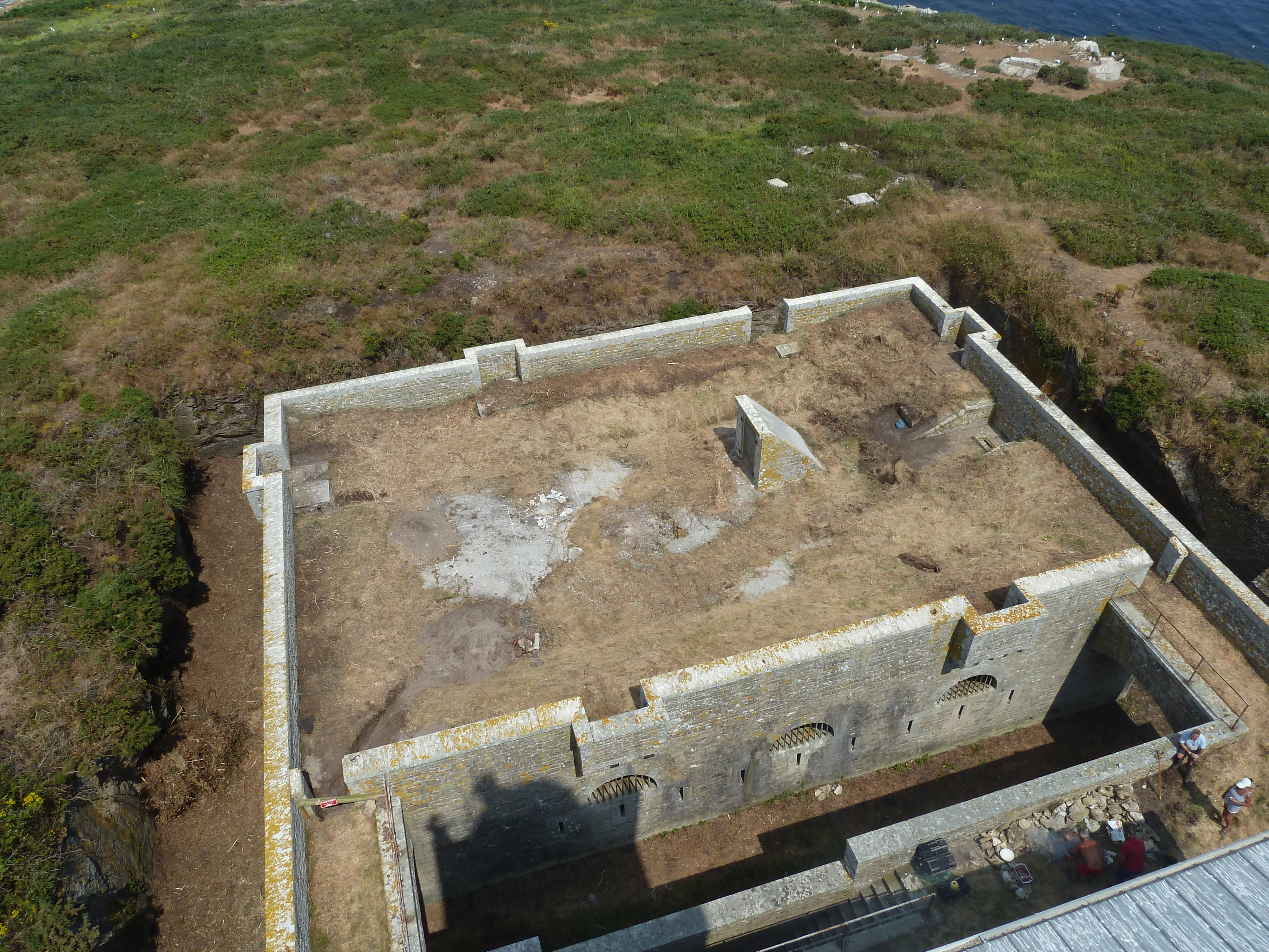 Archipel de Glénan, batterie de Penfret, corps de garde crénelé, vue de la terrasse depuis le sommet du phare en 2013.Immatriculation