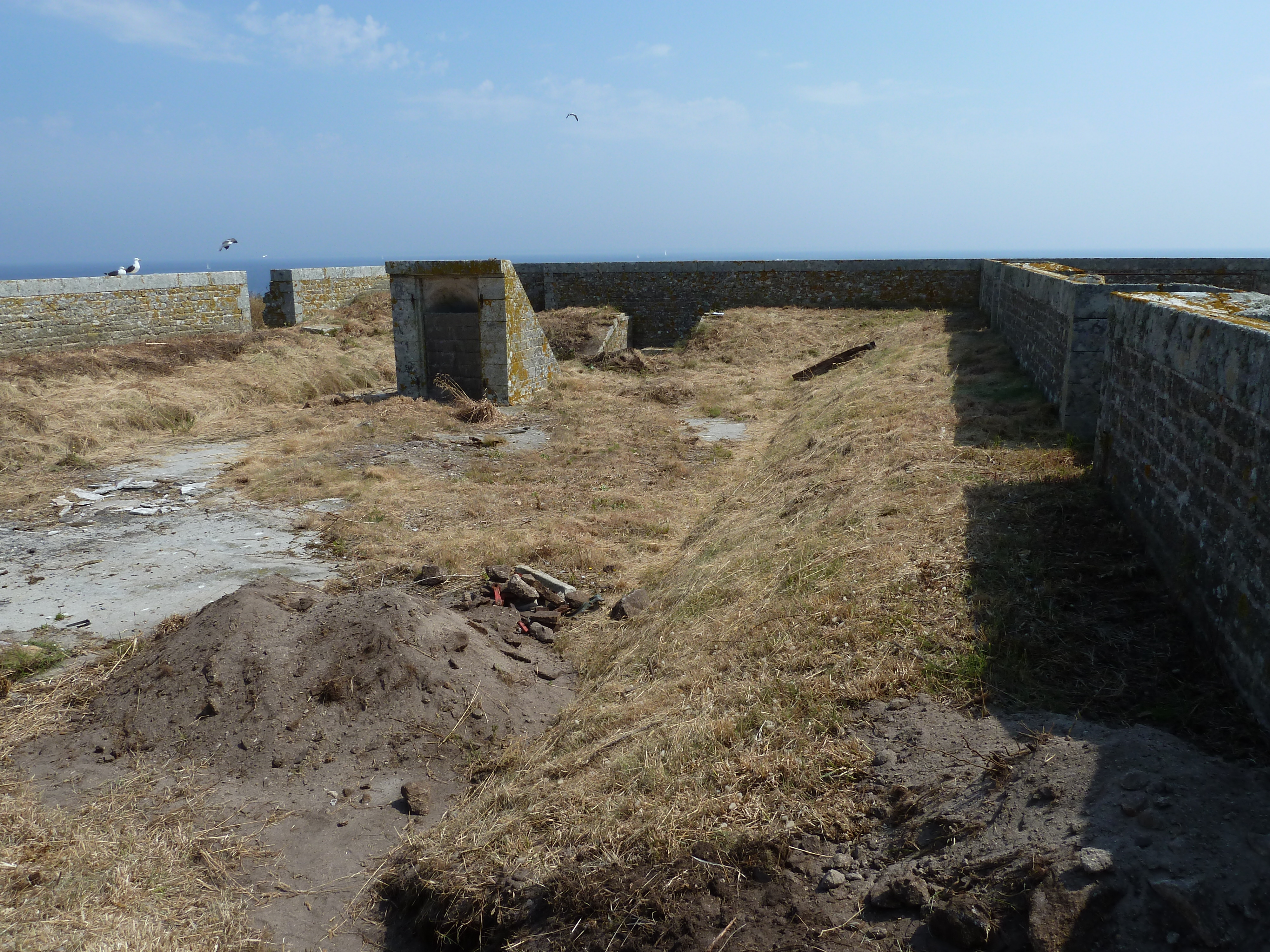 Archipel de Glénan, batterie de Penfret, corps de garde crénelé, la terrasse avec ses banquettes en terre en 2013.Immatriculation
