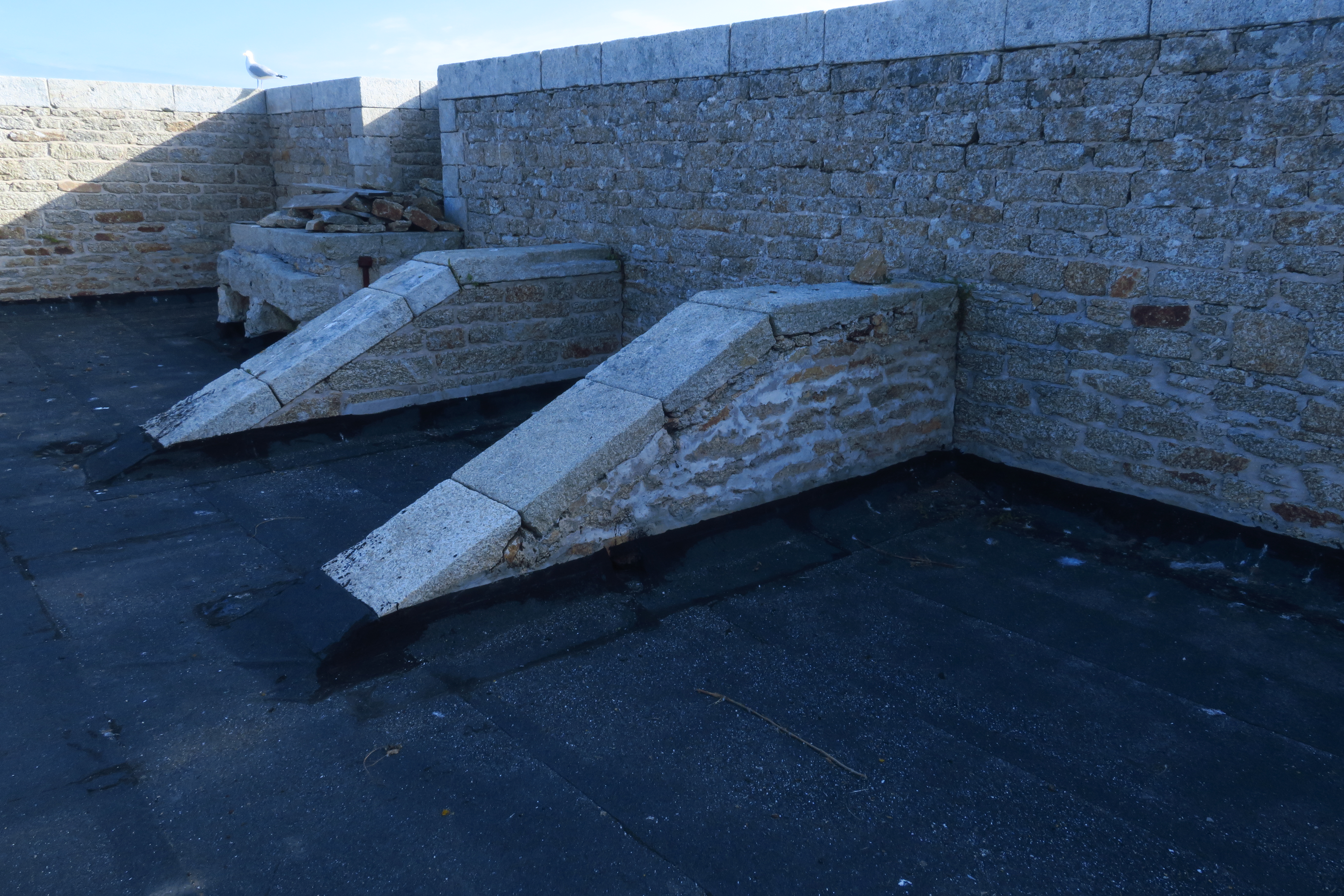 Archipel de Glénan, batterie de Penfret, corps de garde crénelé, la terrasse sans ses banquettes en terre en 2017.Immatriculation