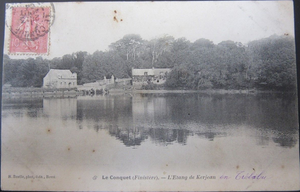 Carte postale, "Le Conquet (Finistère), l'Etang de Kerjean", R. Boëlle edit, vue du moulin et de la maison du meunier depuis l'étangImmatriculation