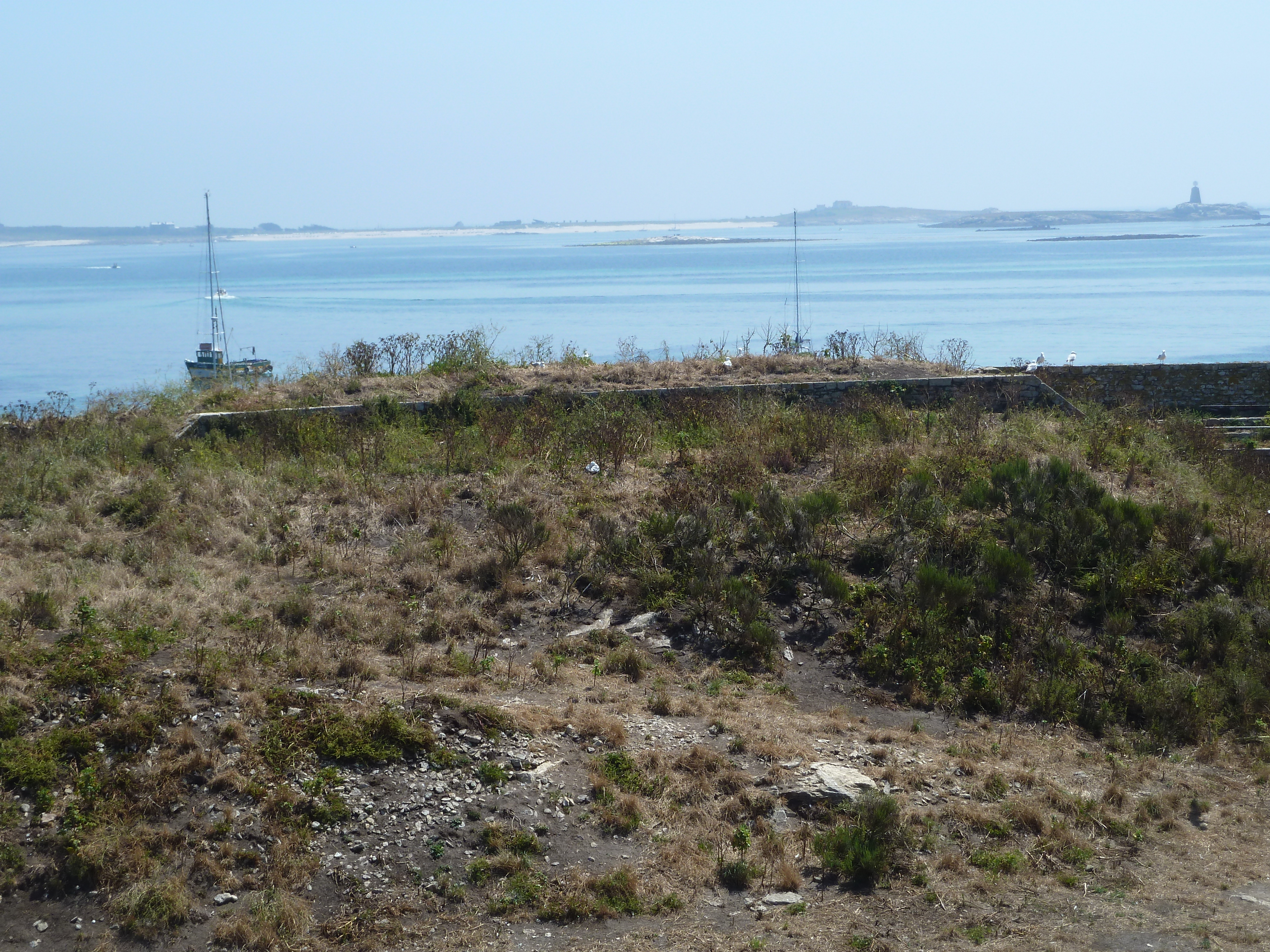 Archipel de Glénan, fort de l'île Cigogne, batterie Est, épaulement des canons et rampe d'accès.Immatriculation