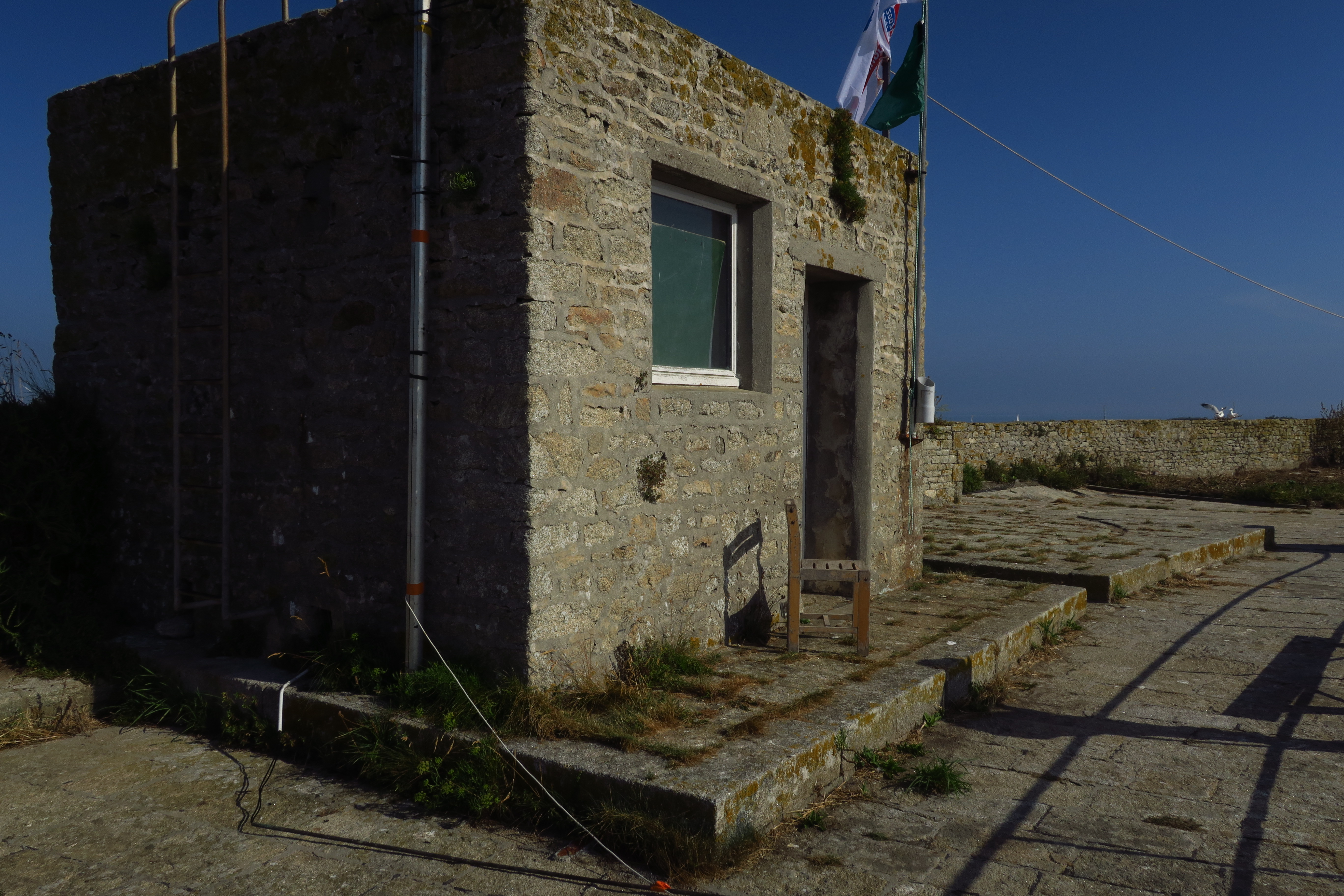Archipel de Glénan, fort de l'île Cigogne, batterie Ouest, plate-forme sud surmontée par un bâtiment.Immatriculation