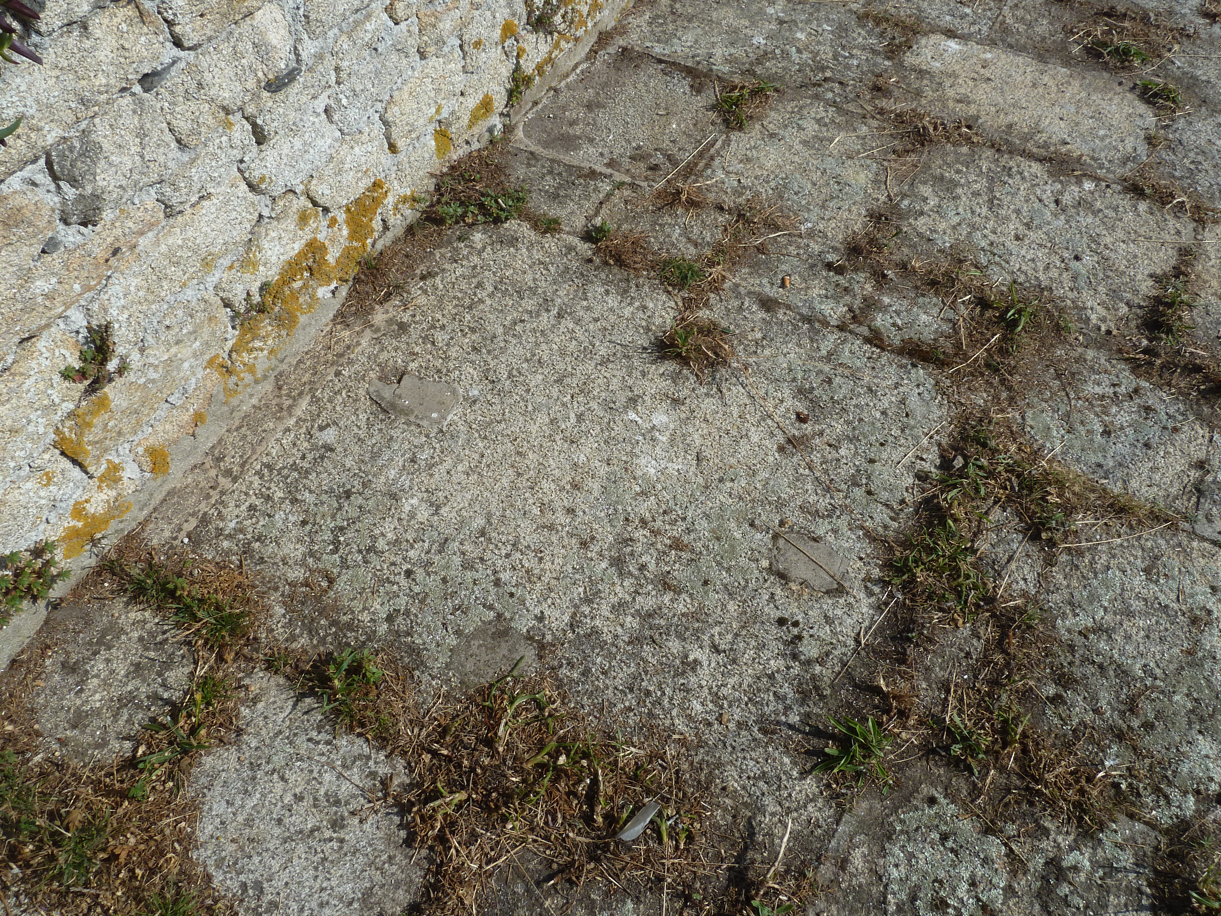 Archipel de Glénan, fort de l'île Cigogne, batterie Ouest, détail de la plate-forme nord, dé de sous-sellette avec ses goujons coupés.Immatriculation