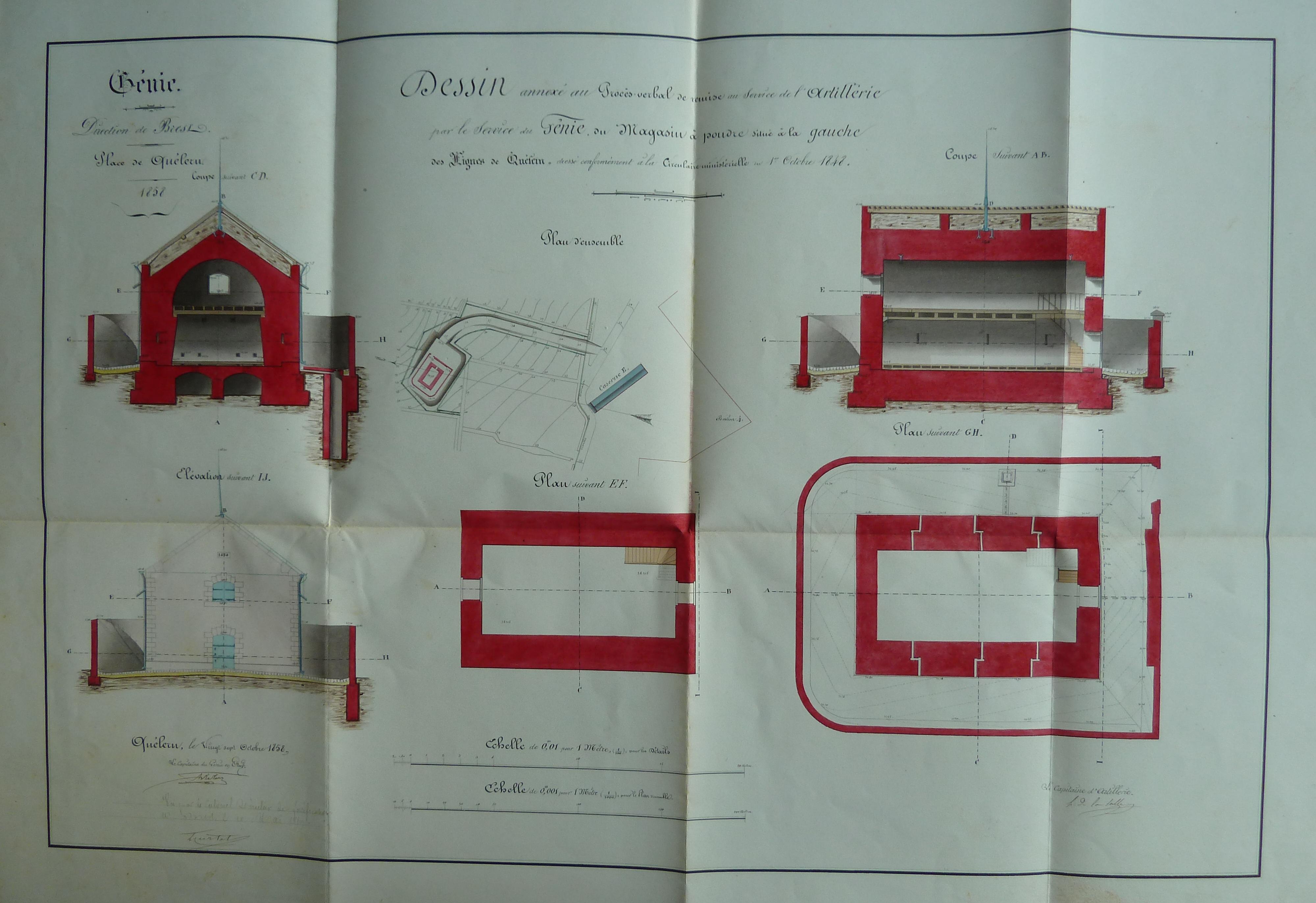 Service historique de la Défense, département Armée de Terre, Vincennes. Archives du Génie ; Article 8, Places françaises et d'Algérie : 1 VH 1500, Place de Quélern, projets et dépenses annuels, 1855-1860. Direction du Génie de Brest, Place de Quélern, dessin annexé au procès-verbal de remise au service de l'Artillerie par le service du Génie, du magasin à poudre situé à la gauche des lignes de Quélern, 27 octobre 1858.