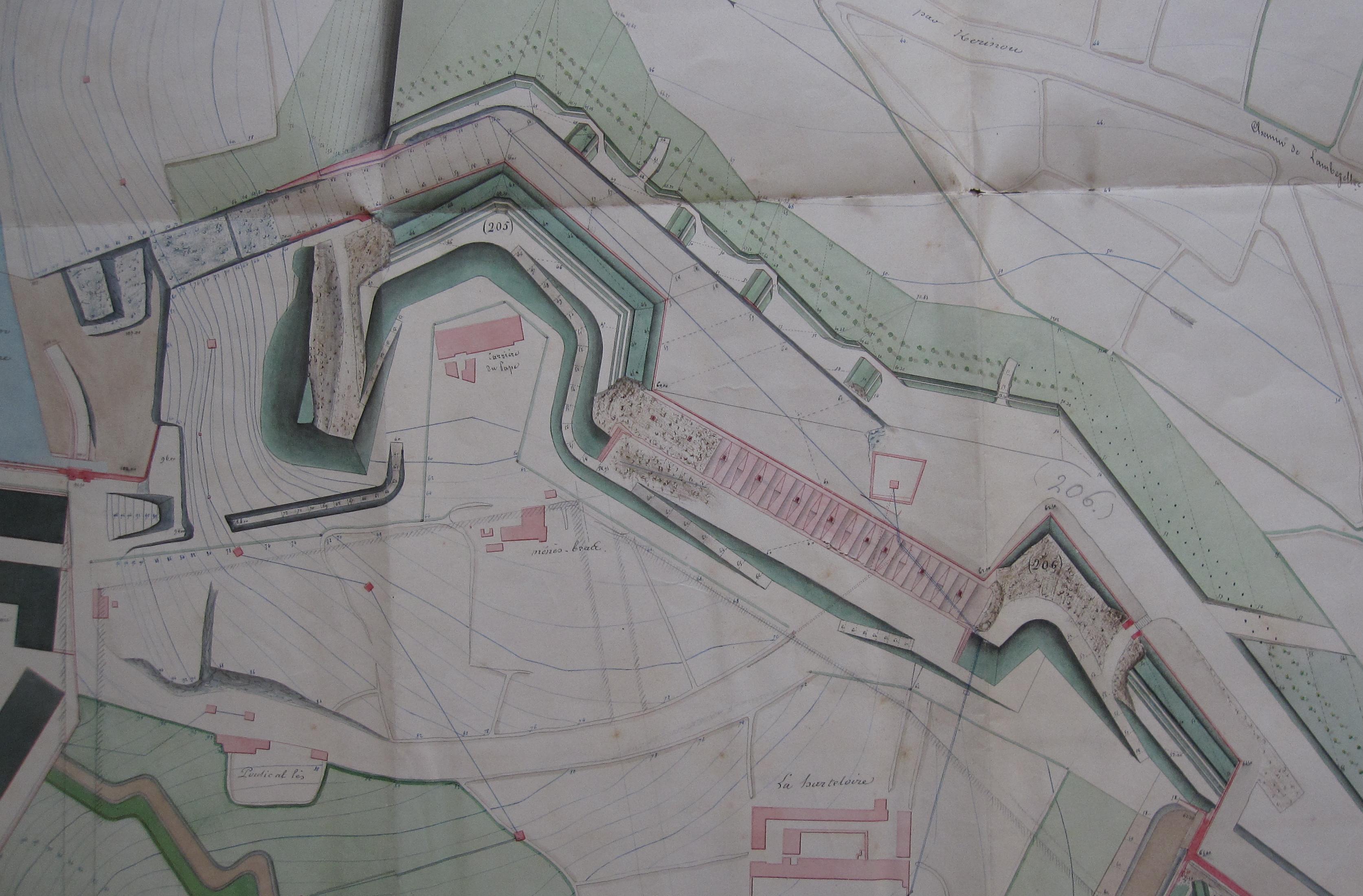 Service historique de la Défense, département Armée de Terre, Vincennes. Archives du Génie ; Article 8, Places françaises et d'Algérie : 1 VH 463, Place de Brest, projets et dépenses annuels, 1845-1848. Direction du Génie de Brest, Place de Brest, feuille n° 3 des projets pour 1845, fermeture de la place dans la traversée du vallon de Kérinou, état d'avancement des travaux à l'époque du 1er mars 1845.