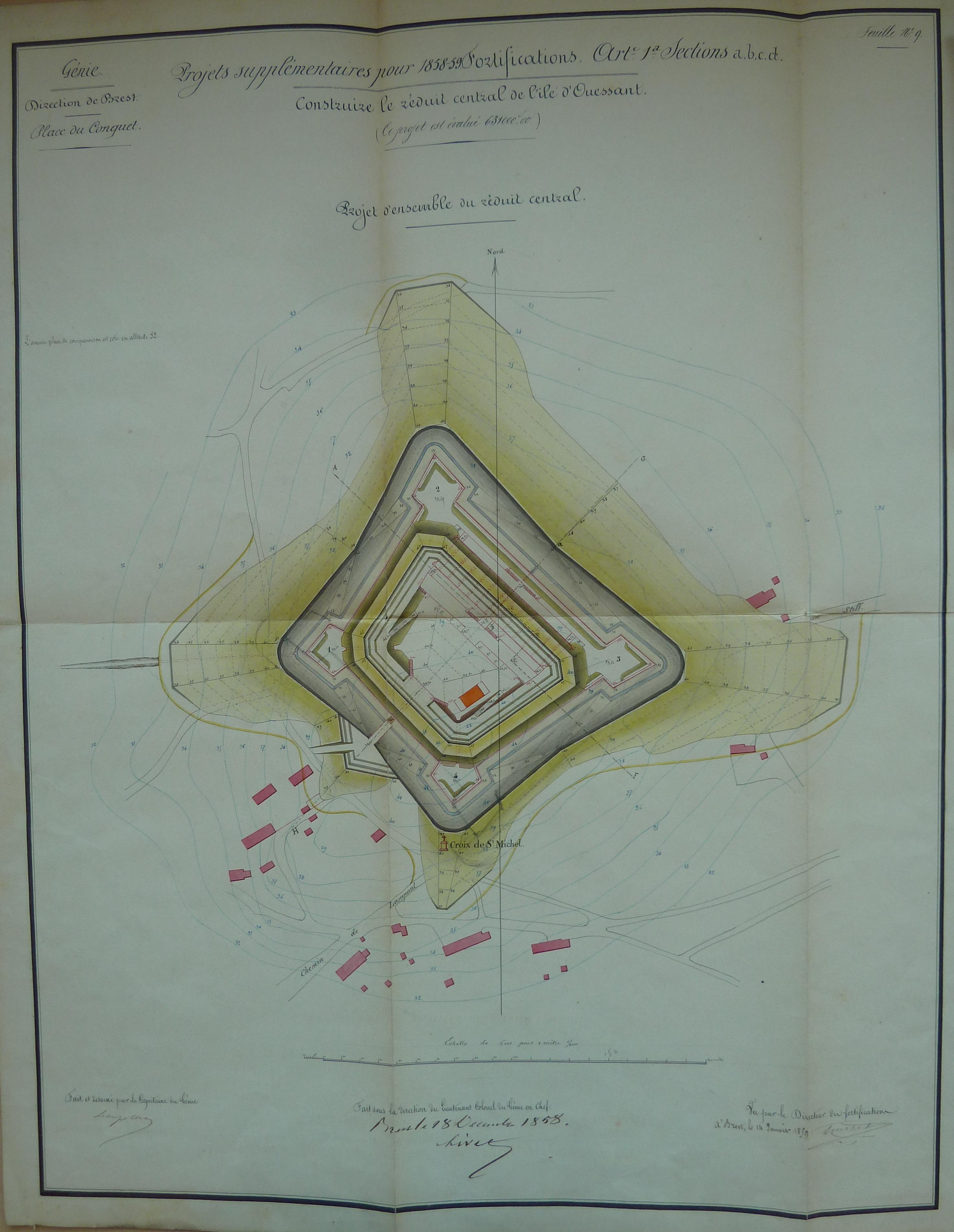 Service historique de la Défense, département Armée de Terre, Vincennes. Archives du Génie ; Article 8, Places françaises et d'Algérie : 1 VH 657, Place du Conquet, projets et dépenses annuels, 1850-1859. Direction du Génie de Brest, Place du Conquet, feuille n° 9 des projets supplémentaires pour 1858-1859, construire le réduit central de l'île d'Ouessant, 18 décembre 1858.