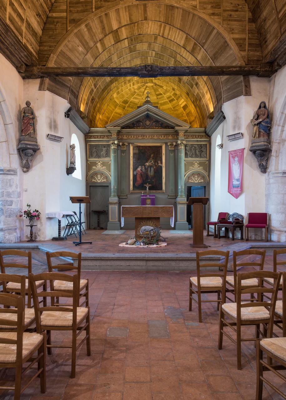 Vue du choeur et de la voûte lambrissée en chêne en plein cintreImmatriculation