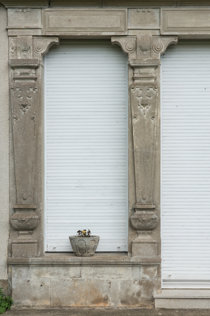 Façade antérieure, détail : pilastres en cimentImmatriculation