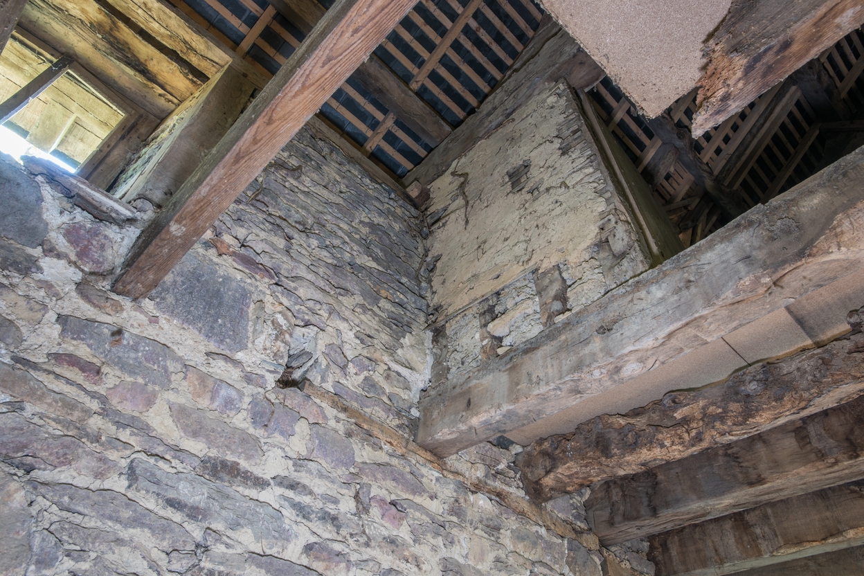 Vue intérieure du moulin. Détail : cloison en torchis de l'étageImmatriculation