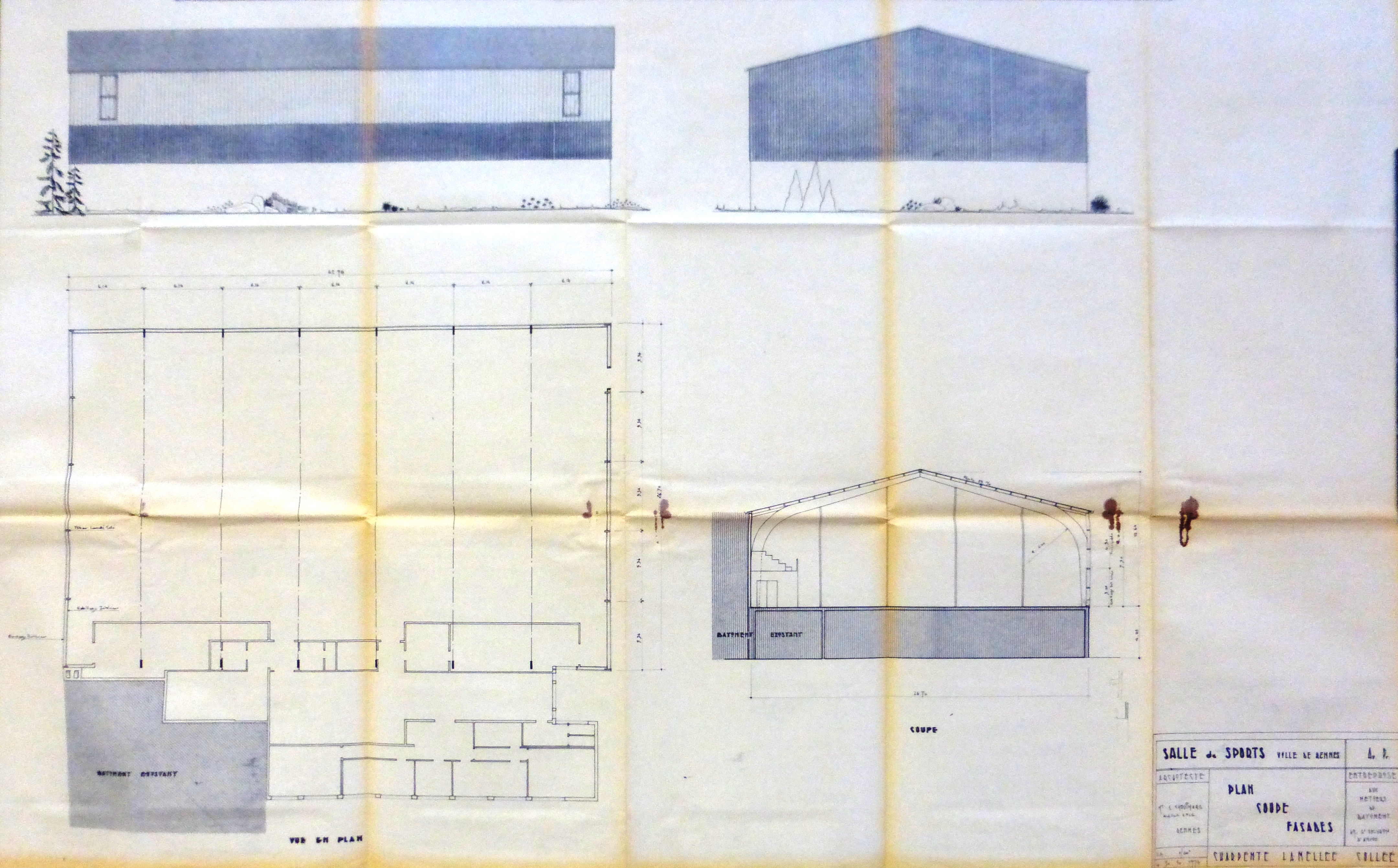 Plan, coupe, façades de la halle de sports (1974)Immatriculation