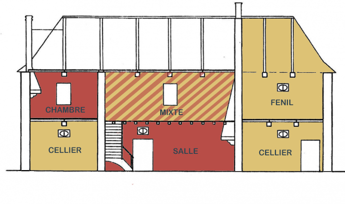 Coupe longitudinale de la ferme du Pâtis Colas (d'après le dessin de Véronique Bardel)Immatriculation