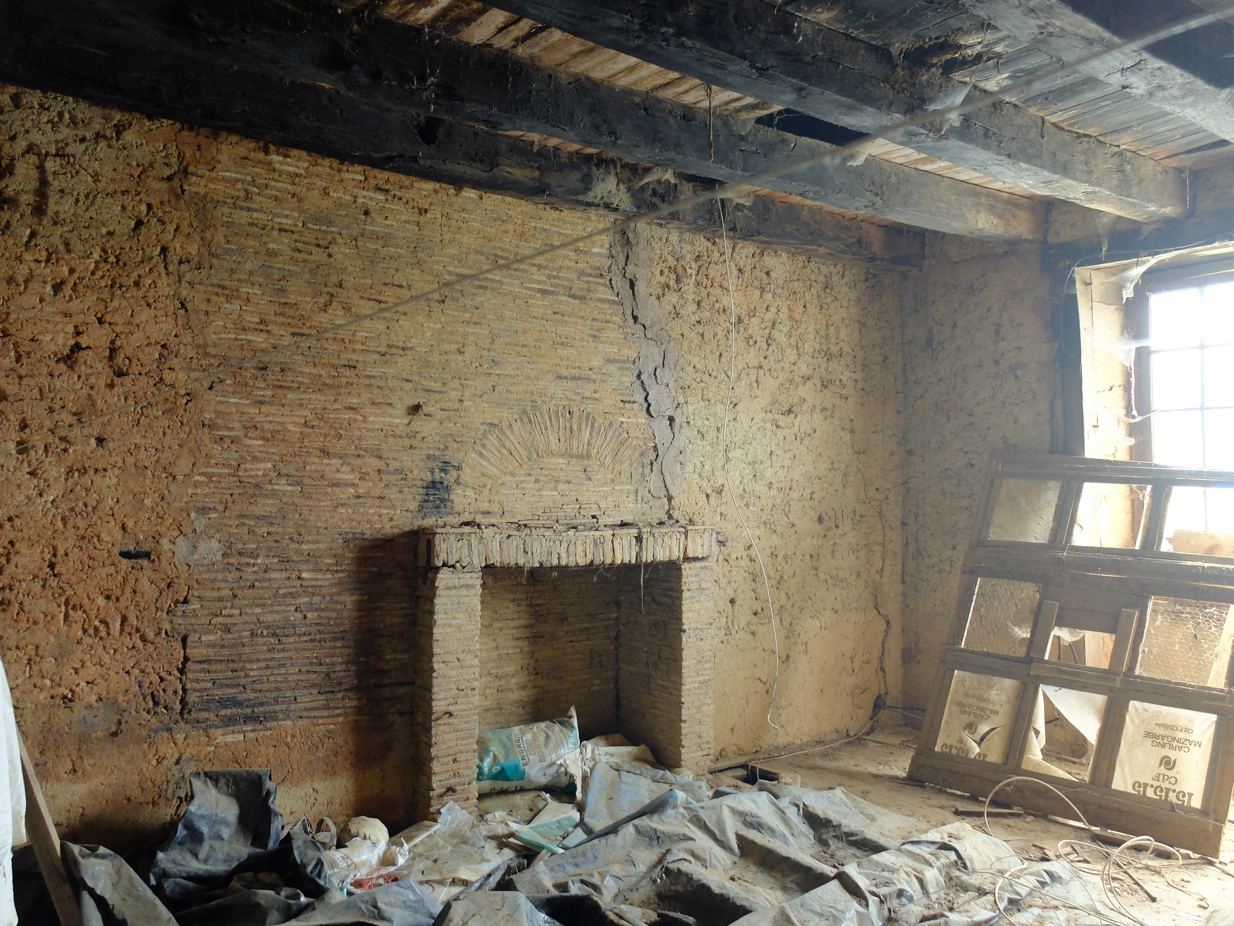 Premier étage, vue de l'intérieur du logis avec cheminée Est en brique, pièce 1Immatriculation