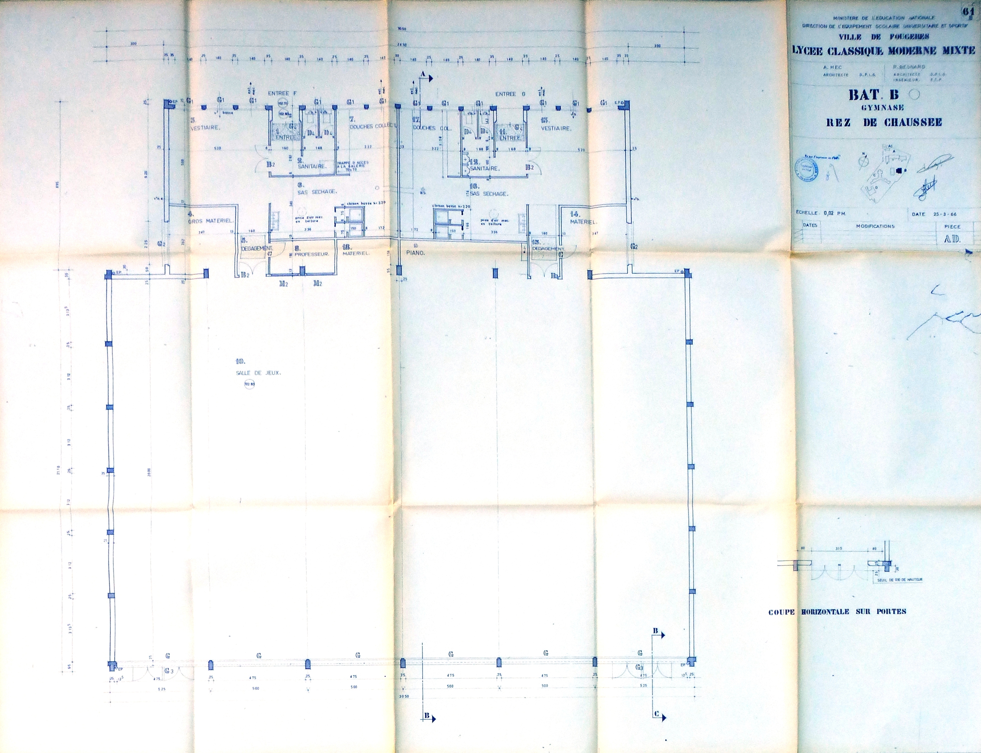 AD Ille-et-Vilaine : 104 W 9. Plan du gymnase (rez-de-chaussée). A. Hec, 1966.