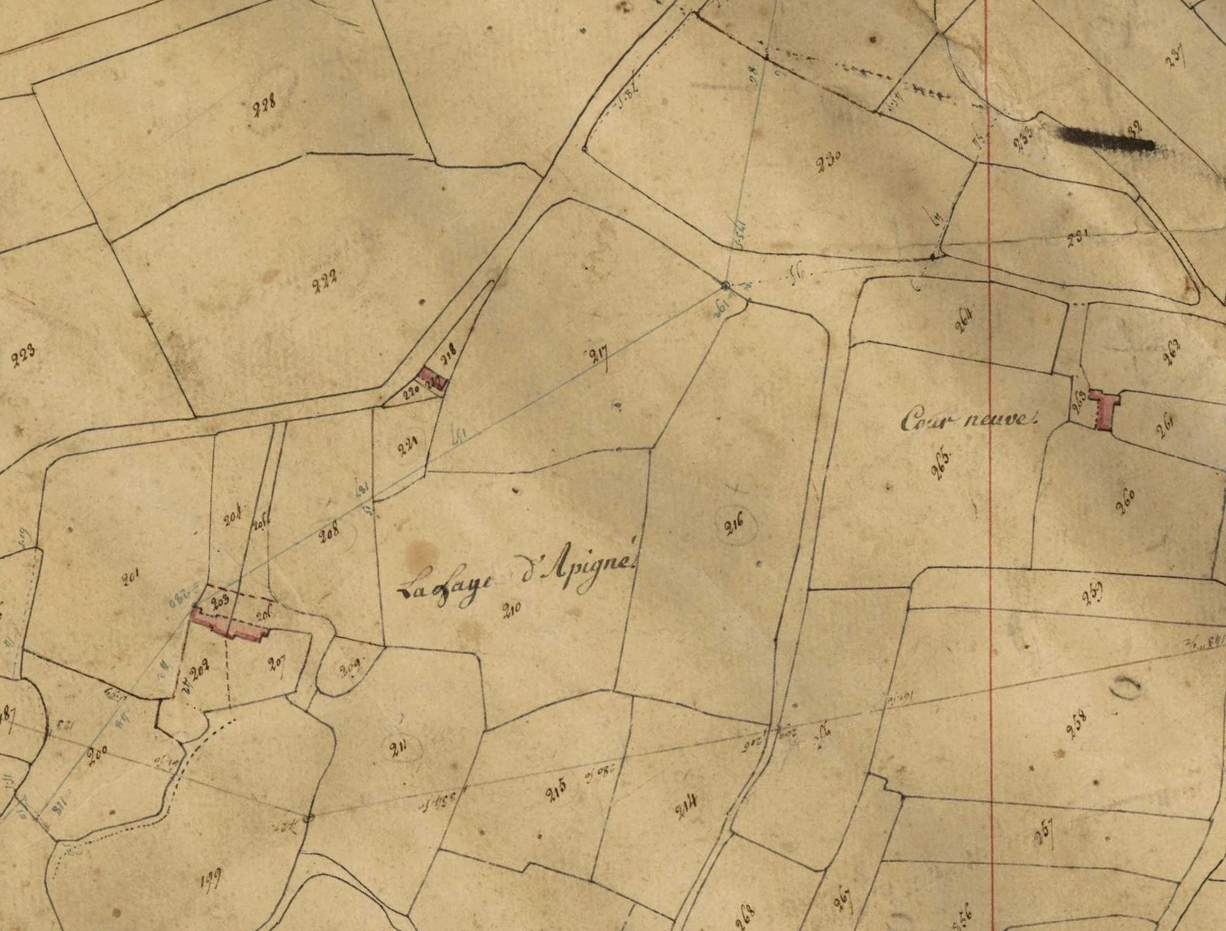 L'ancienne métairie de la Haye d'Apigné sur le cadastre de 1829. Le château actuel est bâti sur la parcelle 210.Immatriculation