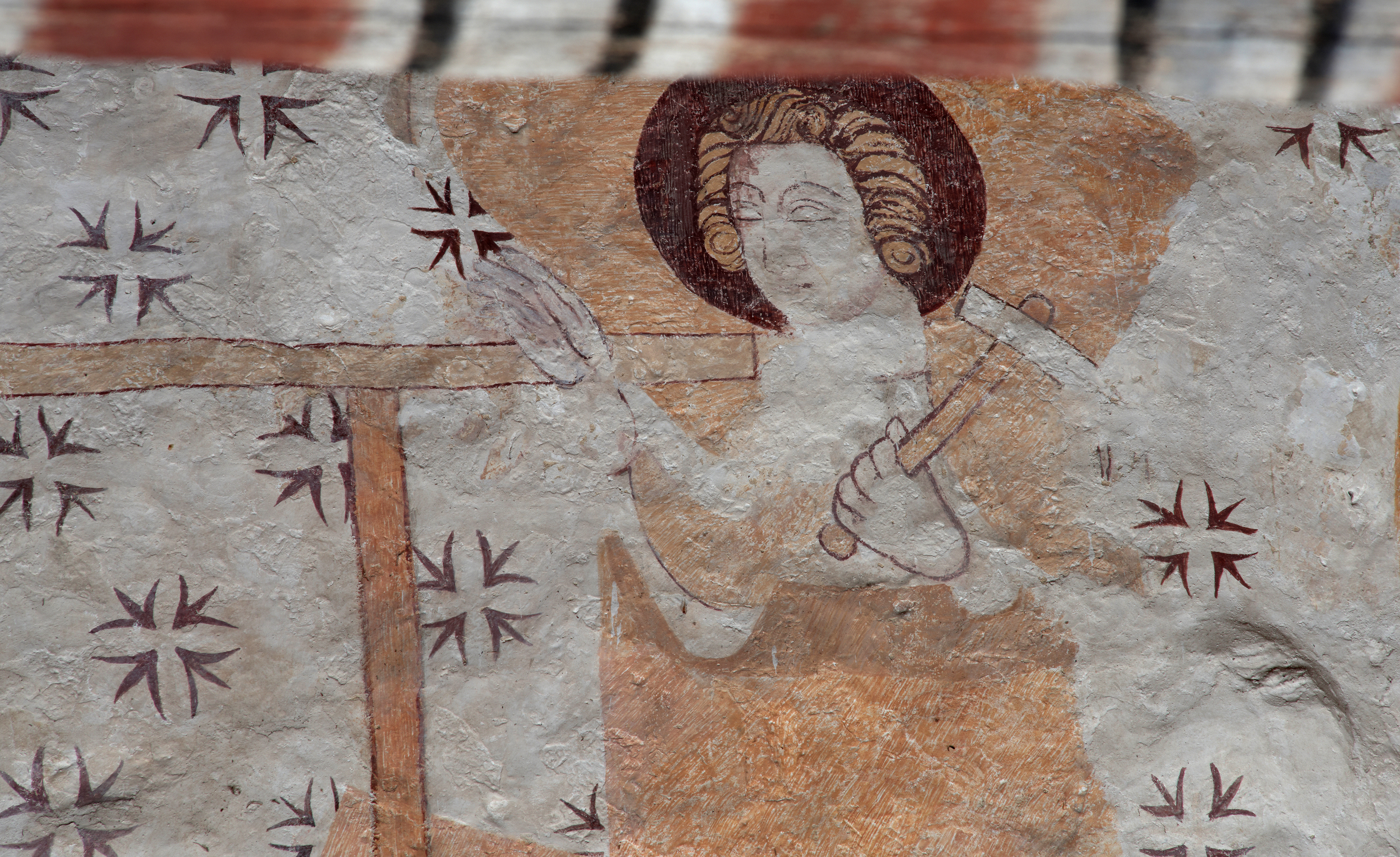 Après restauration des peintures murales en 2015. Arc diaphragme face est, détail du registre inférieur de la résurrectionImmatriculation