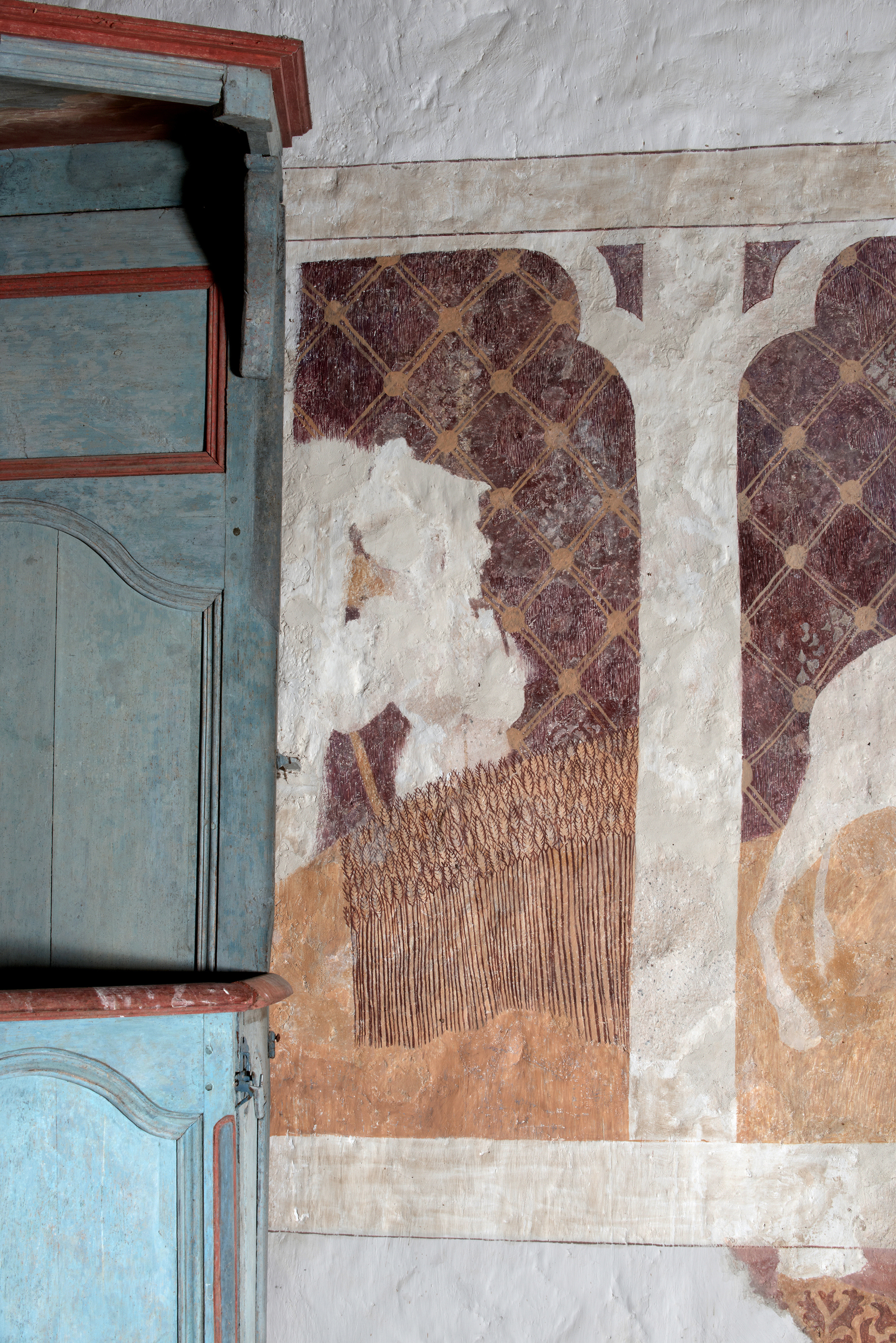 Vue après le chantier de restauration des peintures murales en 2015 . Sur le mur nord du choeur , détail du miracle du champs de bléImmatriculation