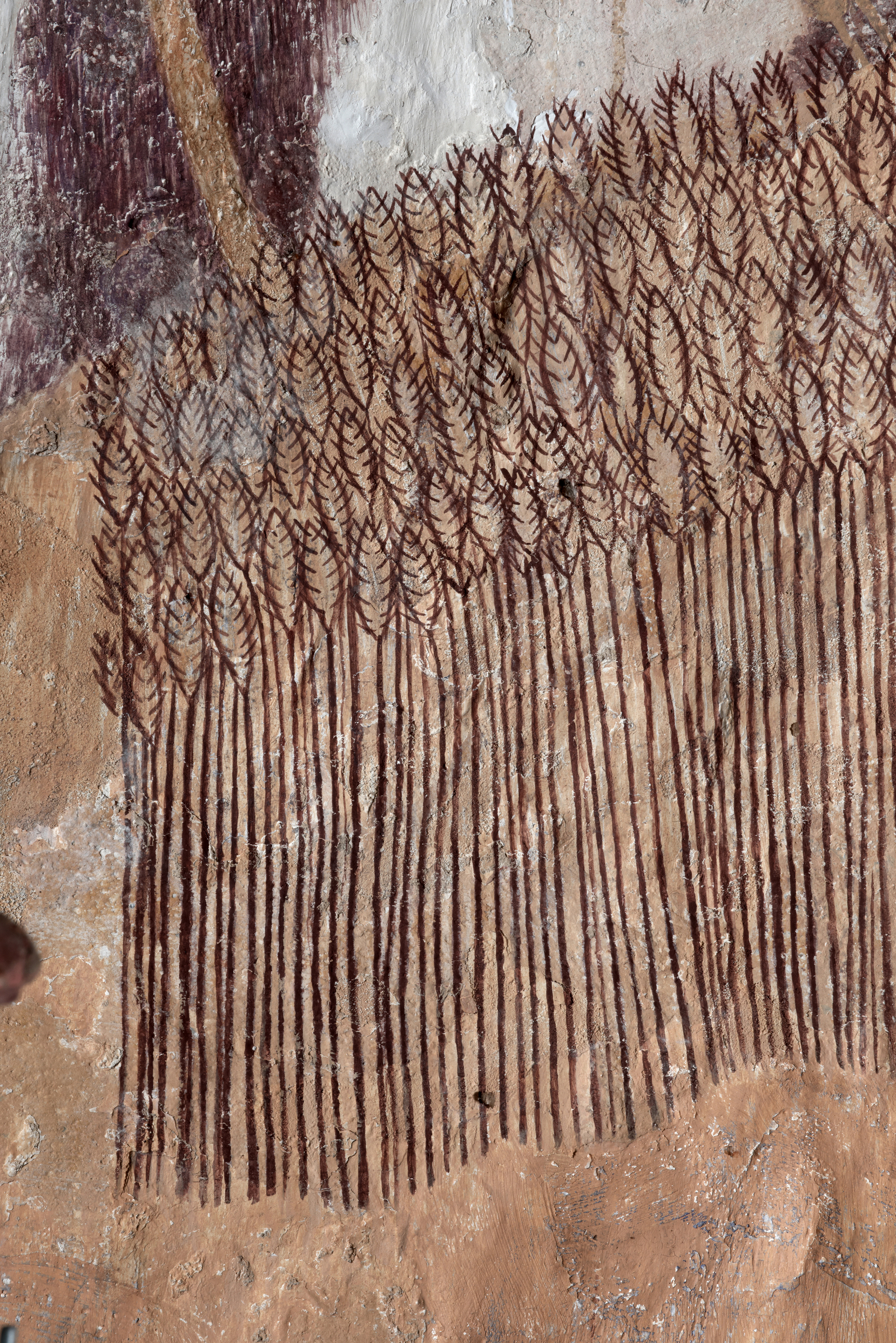 Vue après le chantier de restauration des peintures murales en 2015 . Sur le mur nord du choeur , détail du miracle du champs de bléImmatriculation