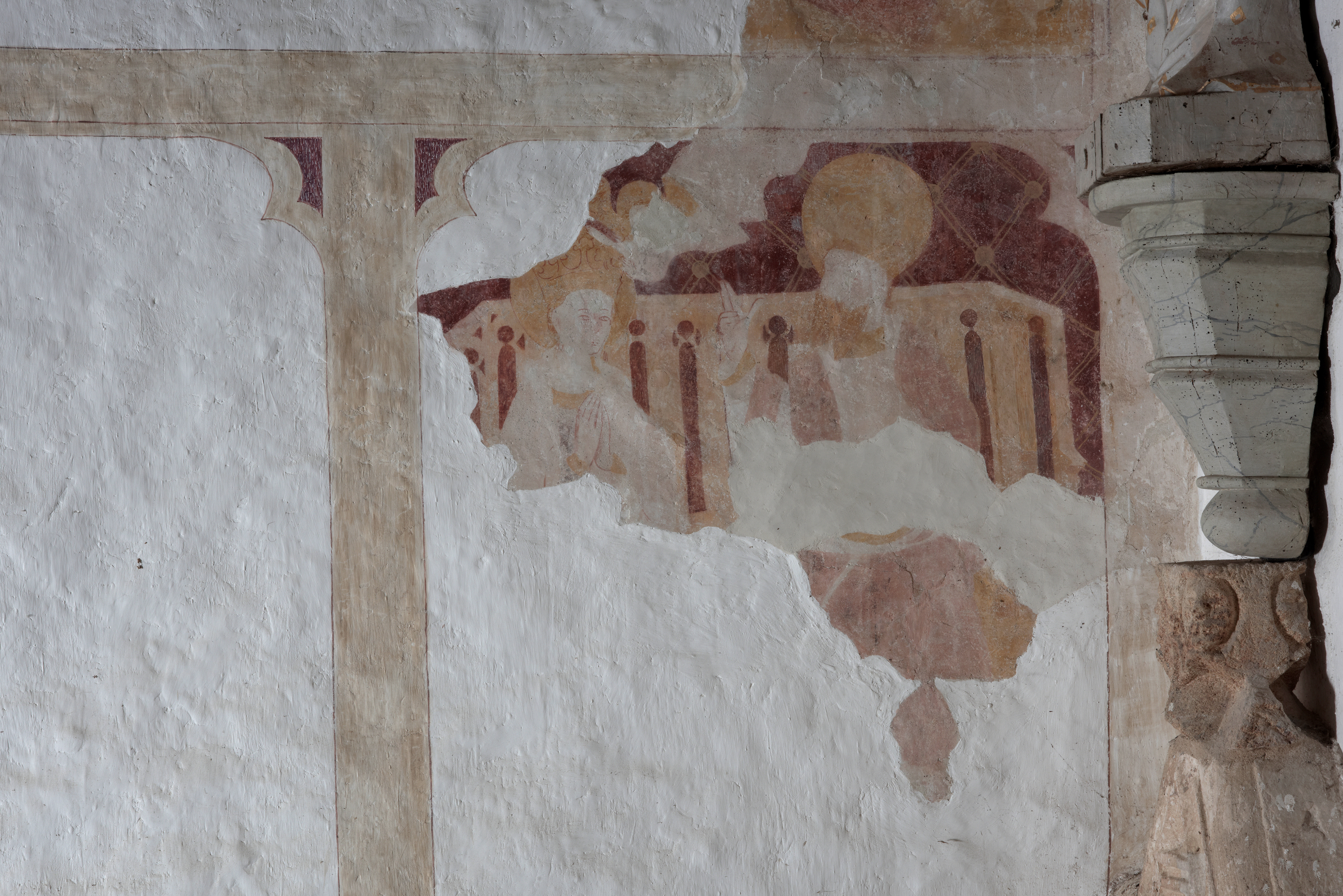 Vue après le chantier de restauration des peintures murales en 2015 . Sur le mur nord du choeur, détail du couronnement de la viergeImmatriculation