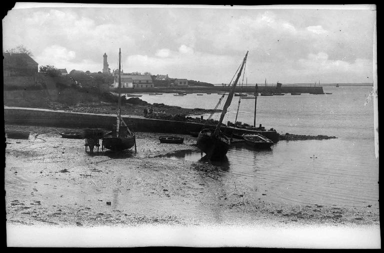 Le port et les deux jetées de Port-Navalo ; au premier plan, bateaux de pêche à voile échoués à marée basse, ArzonImmatriculation