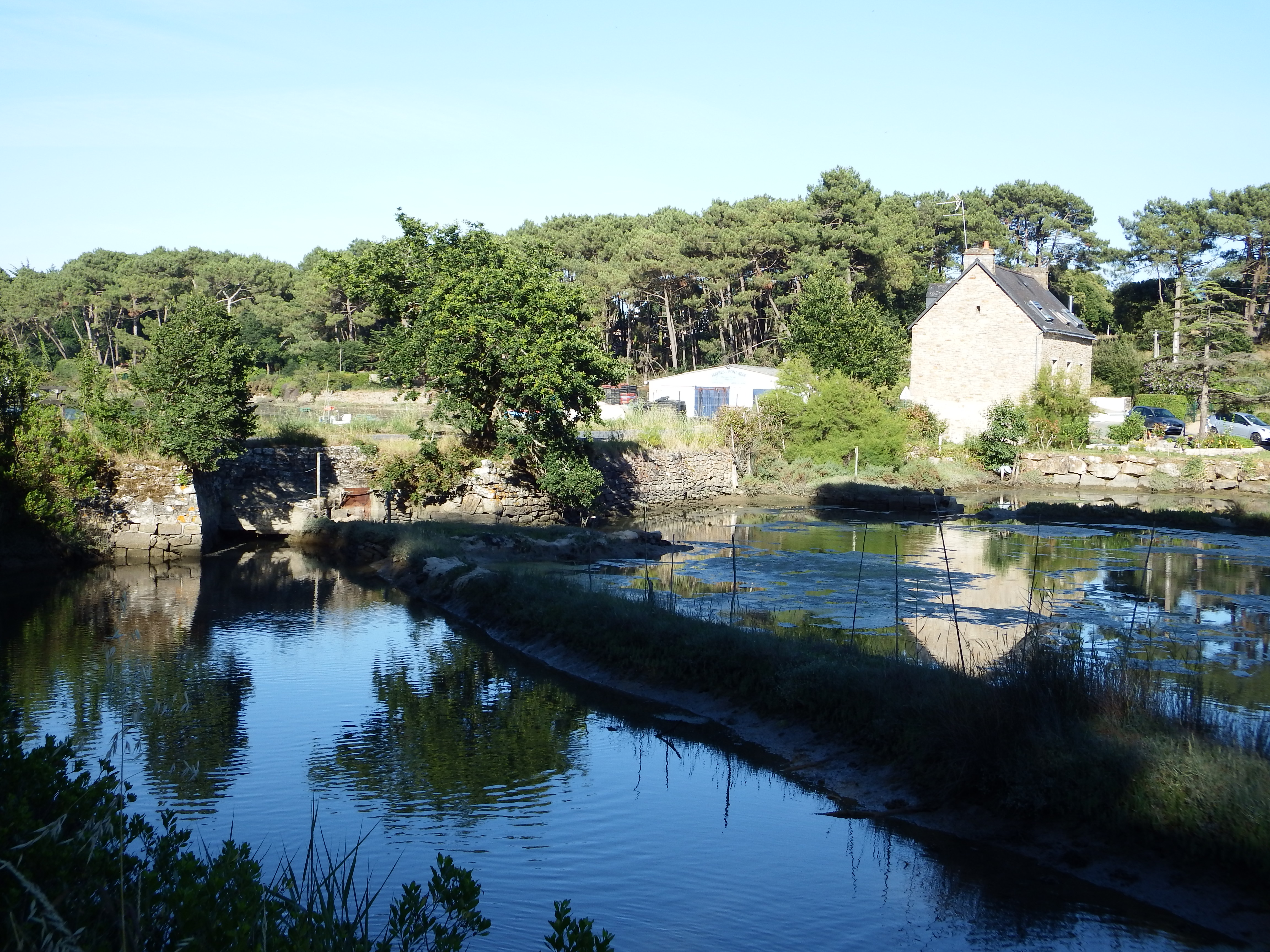Vue amont de la digue et de l'étang du moulin à marée, la maison sur la droite serait donc construite avec les pierres du moulinImmatriculation