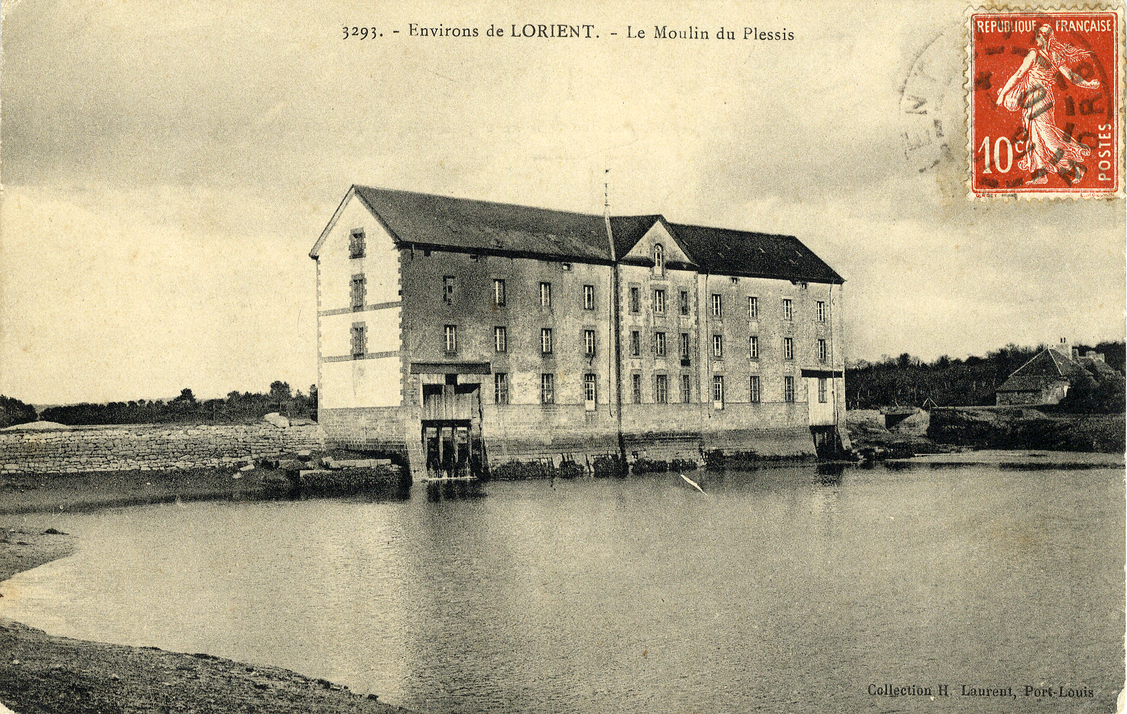 Carte postale "Environs de Lorient, le moulin du Plessis", vue aval, Archives municipales de Lanester, Fonds Leclère, Henri LaurentImmatriculation