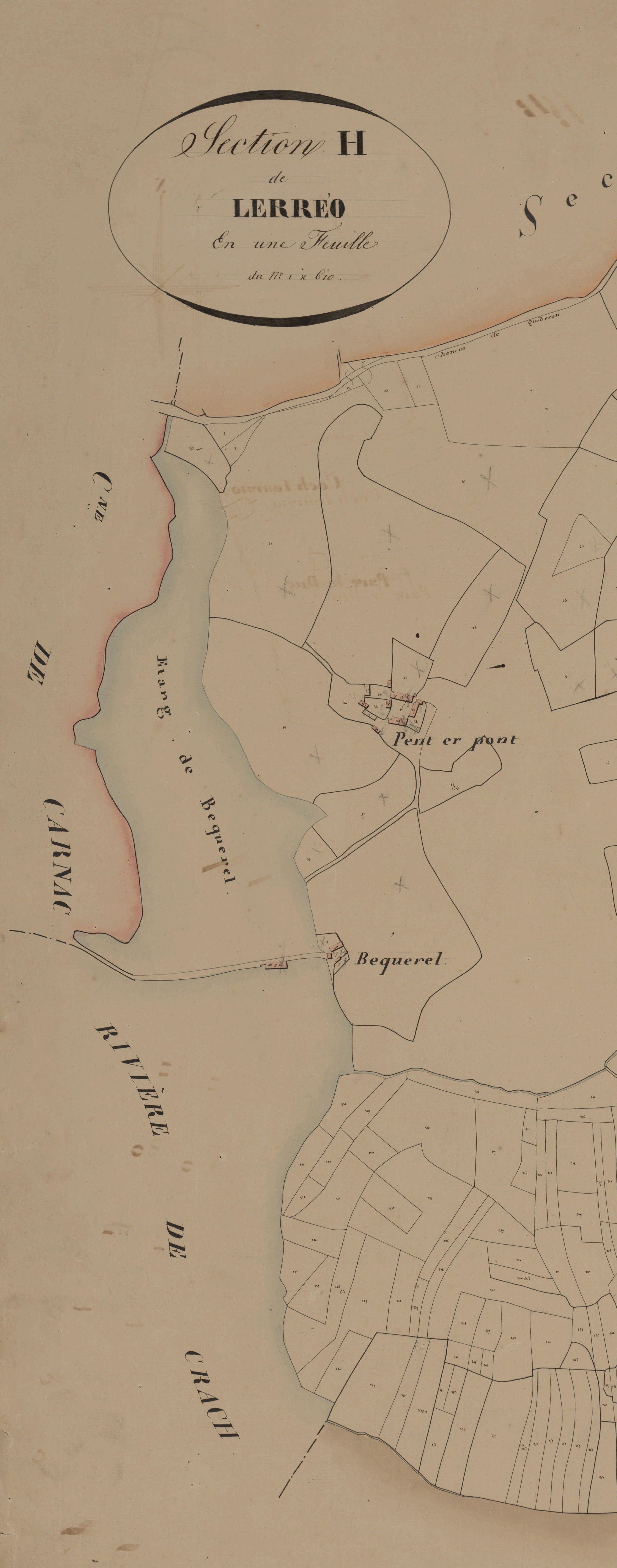 Cadastre de 1831, Le moulin de Becquerel et son étang, 3 P 82/16 - Section H de Lerréo, feuille unique, échelle 1/2 500, parcelles n° 1-610Immatriculation